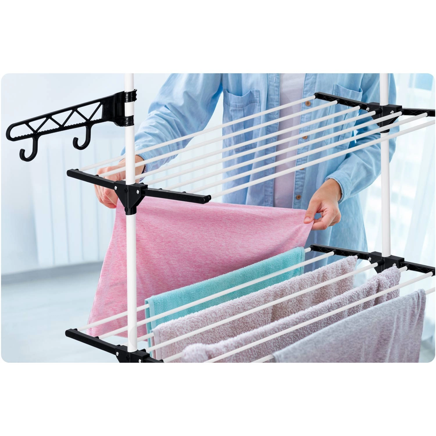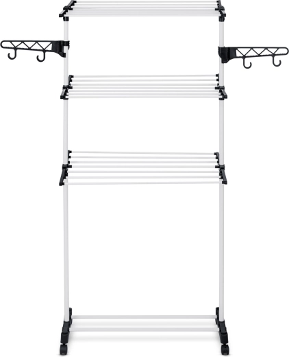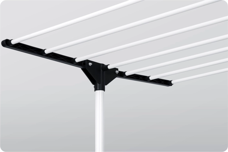 Six niveaux rabattables offrent un séchage flexible, des t-shirts aux serviettes. Les barreaux élargis limitent la formation de plis, rendant souvent le repassage superflu. Des crochets latéraux et des ouvertures pour cintres et petite lingerie libèrent de la place sur les niveaux principaux. Grâce aux espaces intelligemment pensés entre les tiges, l’air circule librement et le linge sèche rapidement et uniformément.