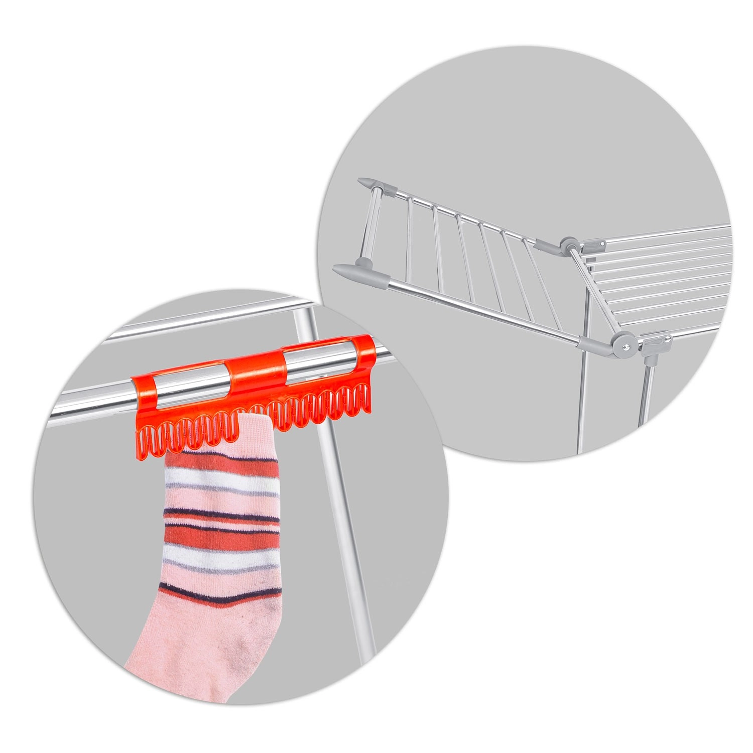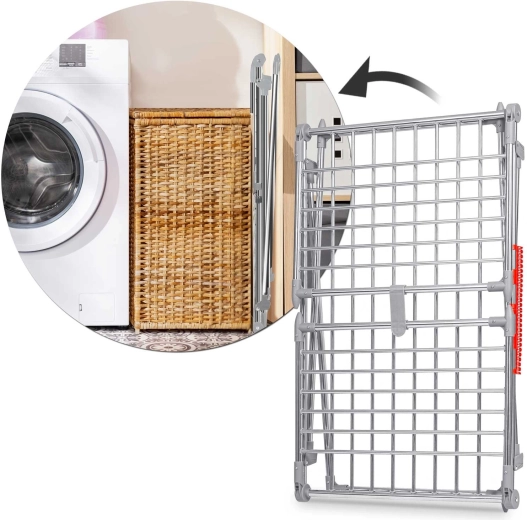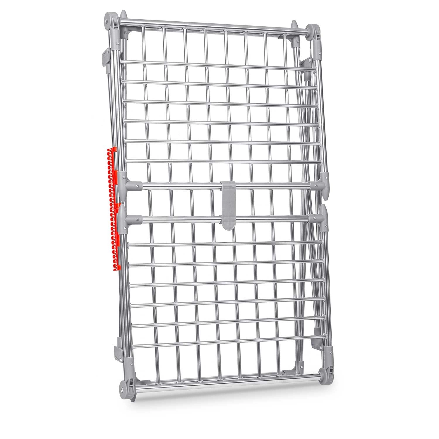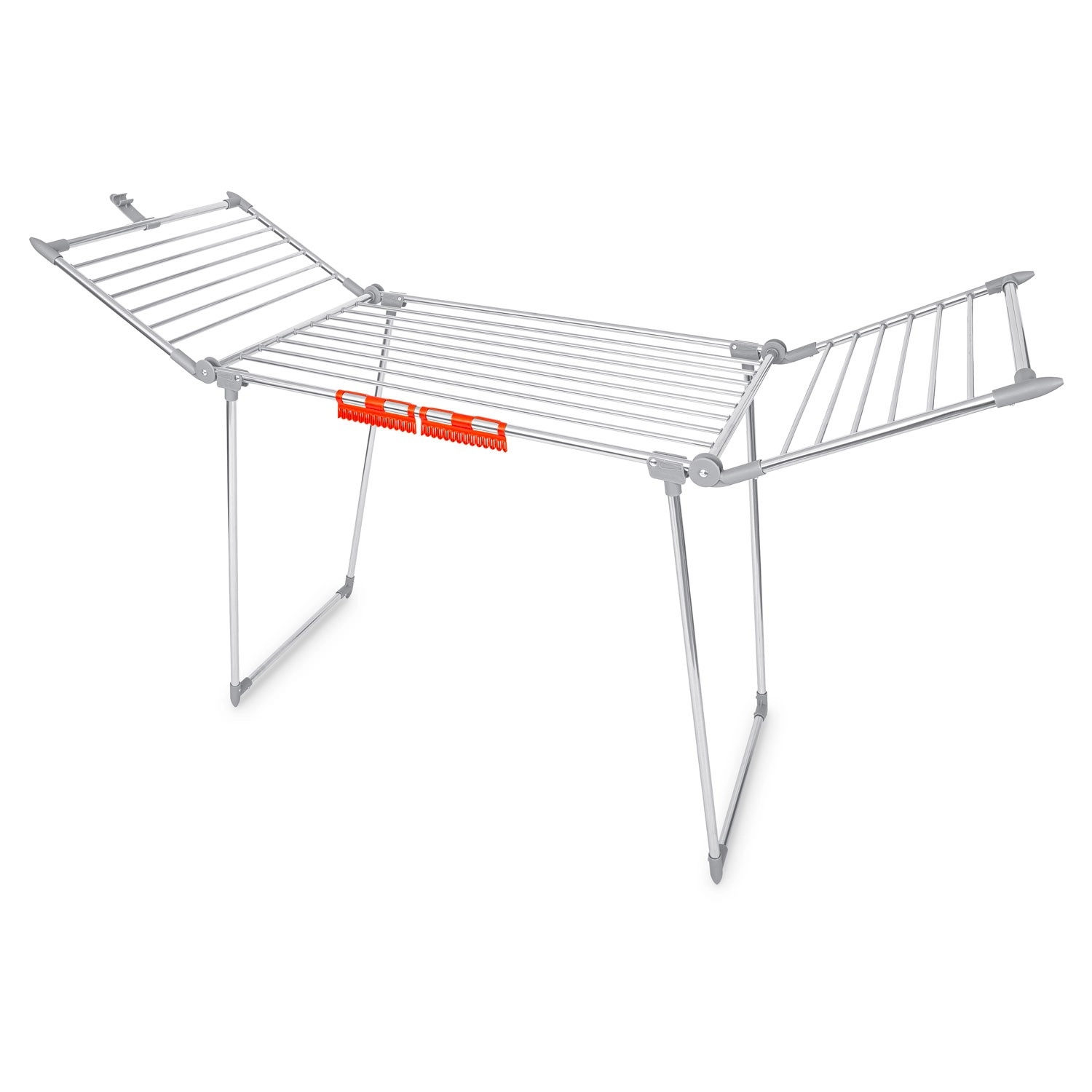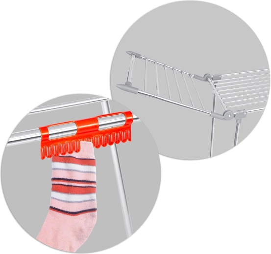 Pratique séchoir à linge pliant en acier inoxydable avec une capacité de séchage de 19 m et deux ailes rabattables pour un espace supplémentaire. Il dispose de porte-linge pour petits articles (chaussettes, sous-vêtements), d’une structure métallique stable et de pieds antidérapants. Grâce à des barreaux plus épais, il réduit les plis superflus et le linge sèche plus vite et de manière uniforme. Un pliage et dépliage simples et rapides permettent de gagner de la place dans chaque foyer.