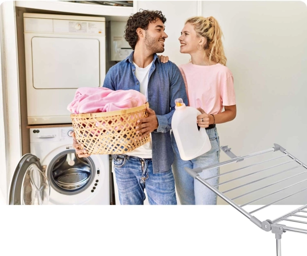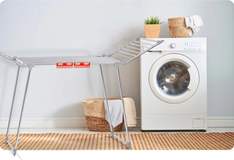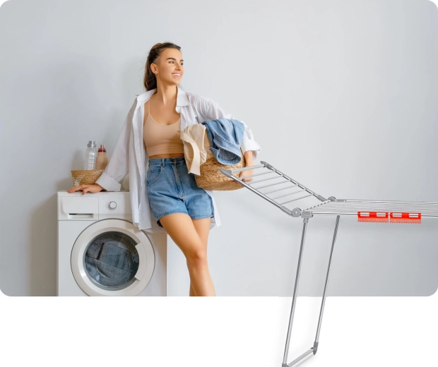 Deux ailes escamotables et une disposition bien pensée des tiges offrent jusqu’à 19 mètres de surface de séchage – idéal pour les lessives familiales.