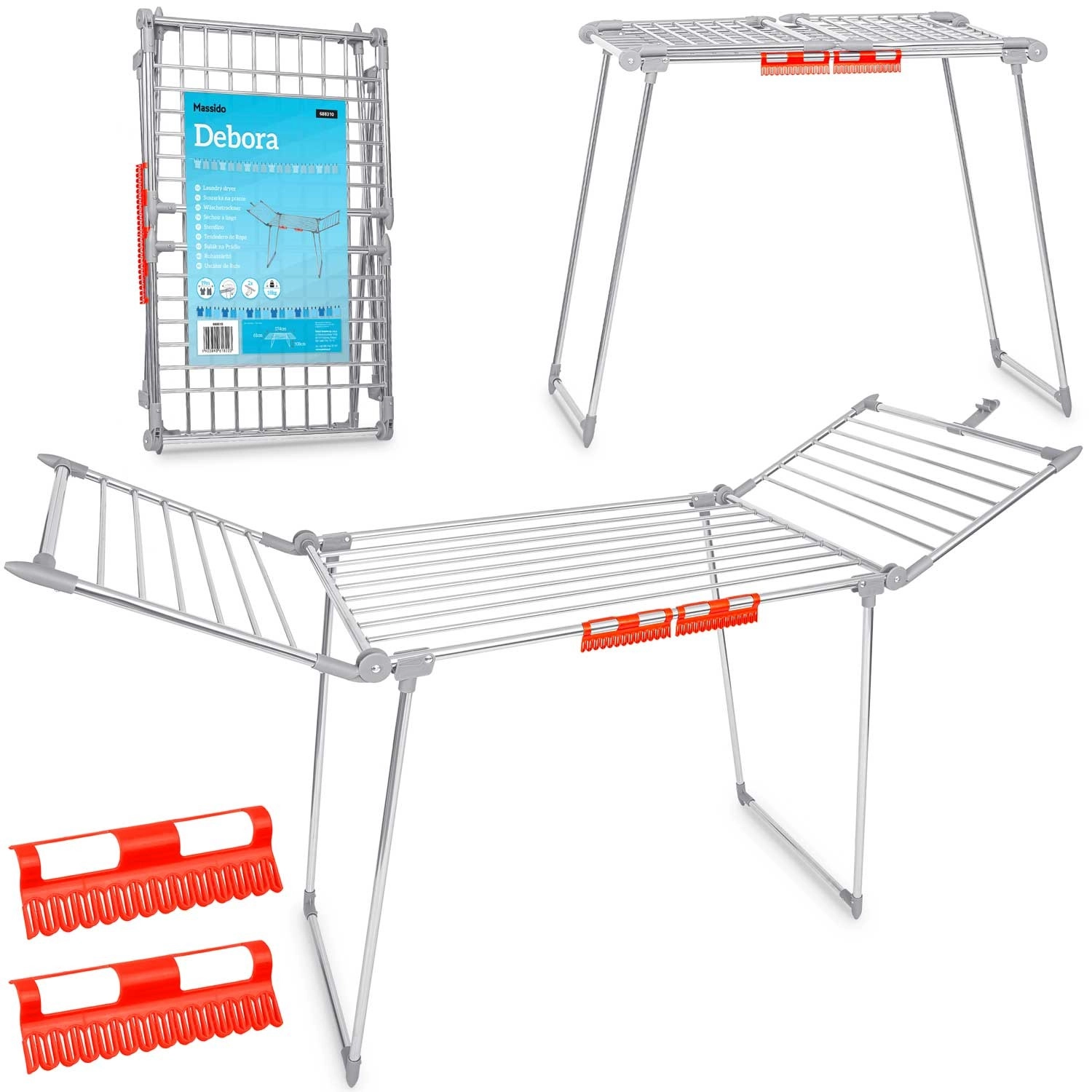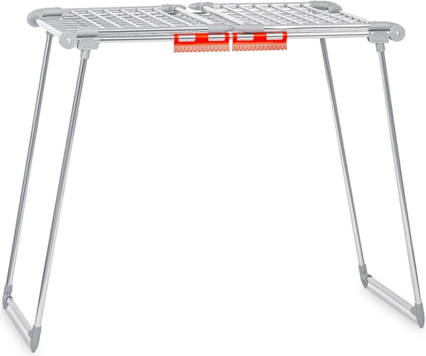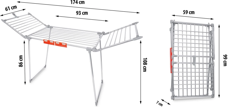 Le séchoir se transporte facilement, se plie rapidement en un format compact et, grâce à ses pieds antidérapants, reste bien en place aussi bien à l’intérieur que sur le balcon. Les pinces et supports intégrés pour les petits articles libèrent de l’espace sur les tiges principales et augmentent la capacité totale. Sa structure en acier inoxydable garantit une longue durée de vie et un entretien facile.