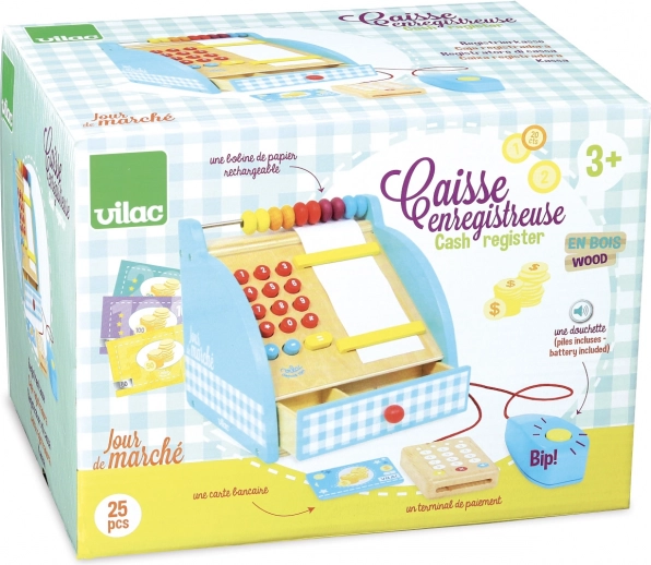La caisse enregistreuse en bois VILAC au style élégant ravira les petits vendeurs et vendeuses. Elle offre un clavier numérique fonctionnel, un tiroir-caisse, un compteur et un terminal bancaire. Sont inclus également des billets et pièces ainsi qu’un bouton sonore classique qui donne plus d’authenticité au jeu.