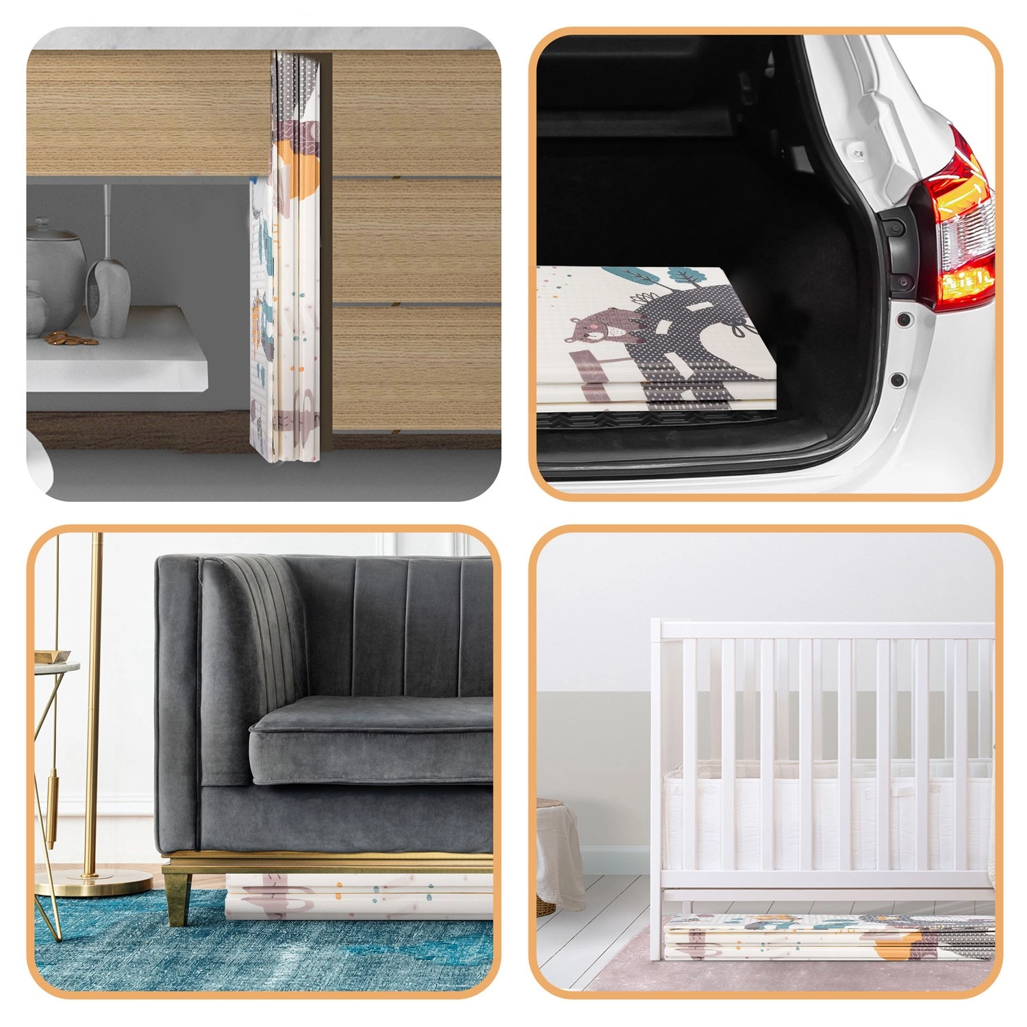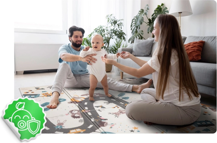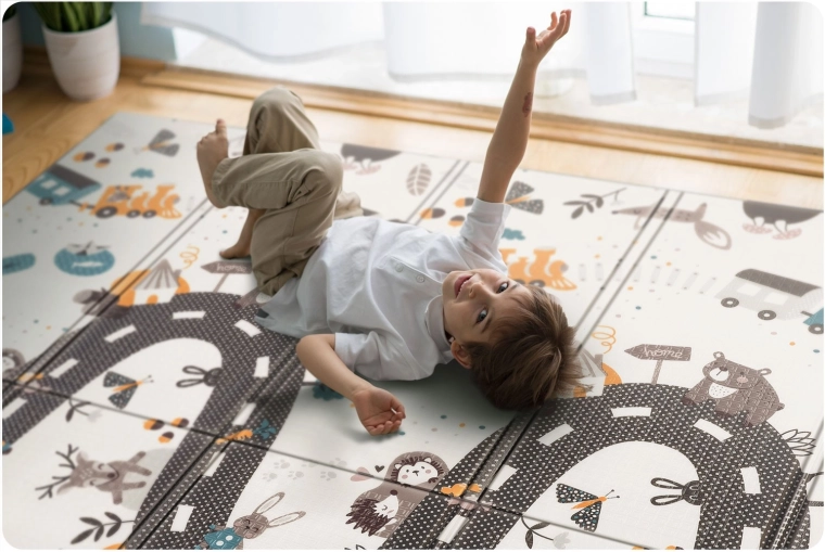 Conçu avec un soin particulier pour la communication visuelle et les besoins des enfants : finitions soignées, couleurs élégantes, certification européenne CE et tests EN71-1, EN71-2, EN71-3. Le tapis devient un accessoire stylé pour l’intérieur et une base fiable pour le jeu quotidien, l’exercice et les moments en famille.