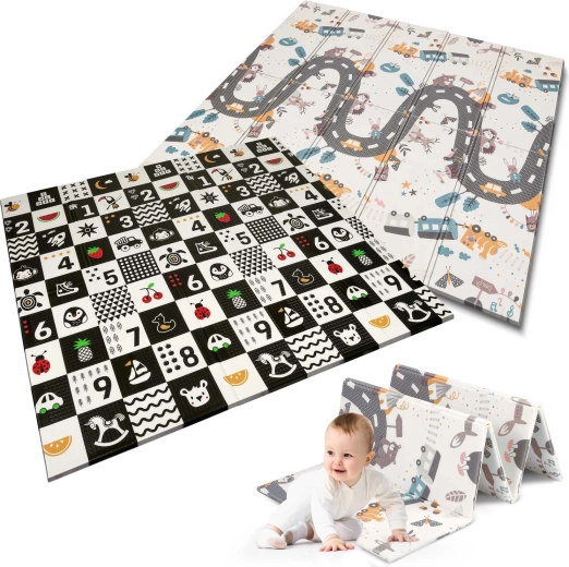 Un côté propose des motifs éducatifs à fort contraste avec des chiffres pour stimuler la vision et l’éveil précoce, l’autre côté présente une scène routière et animale pour un jeu créatif et l’imagination.