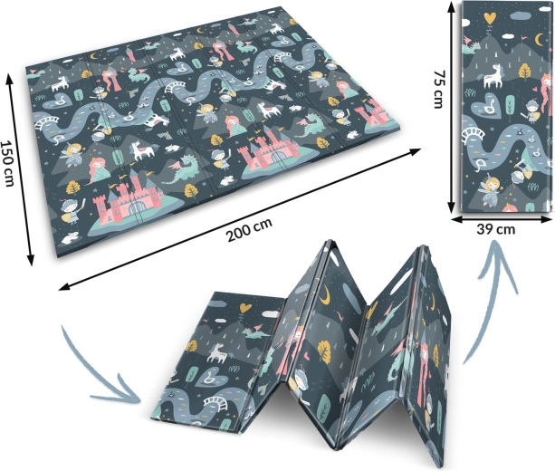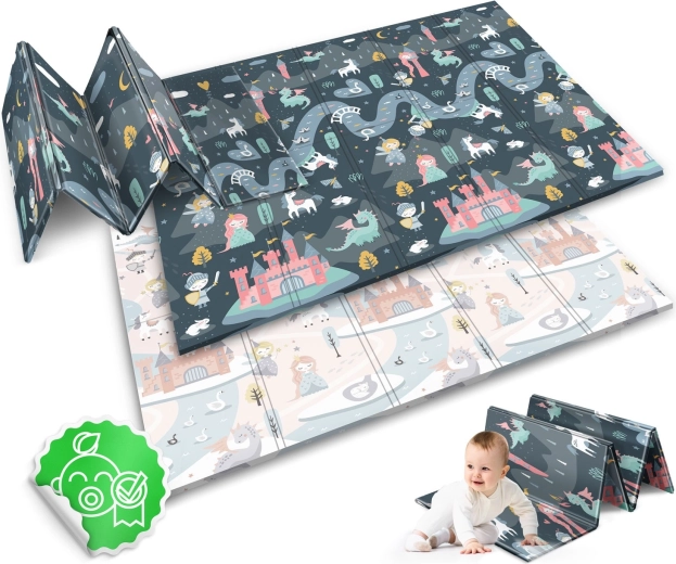 Le tapis est imperméable et facile à nettoyer – il suffit d’essuyer avec un chiffon humide. Sa structure antidérapante assure la stabilité sur différents sols et son pliage solide à répétition facilite le transport et le rangement à la maison, dans la voiture ou sous le lit. Le matériau ne contient ni BPA, ni PVC, ni phtalates, ni formamide et répond aux normes de sécurité européennes EN71, avec certification CE.