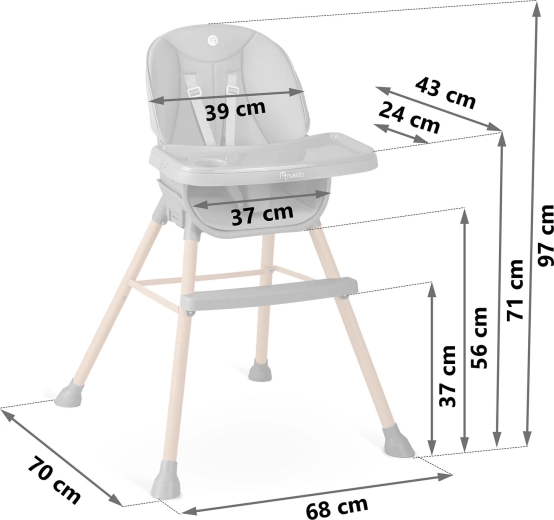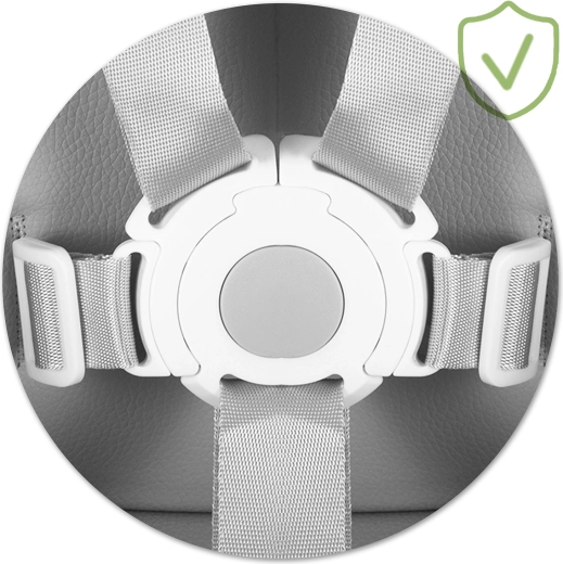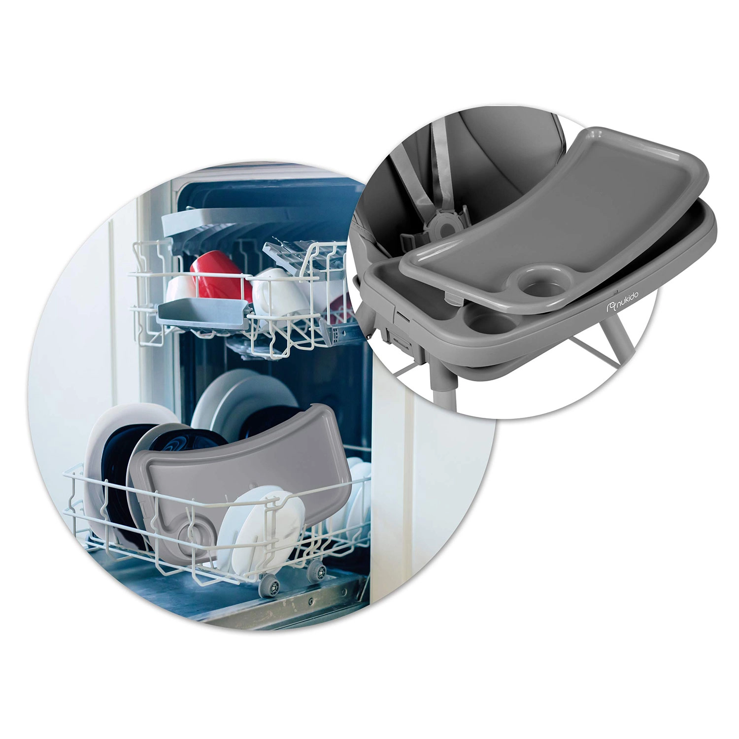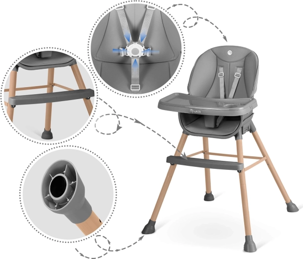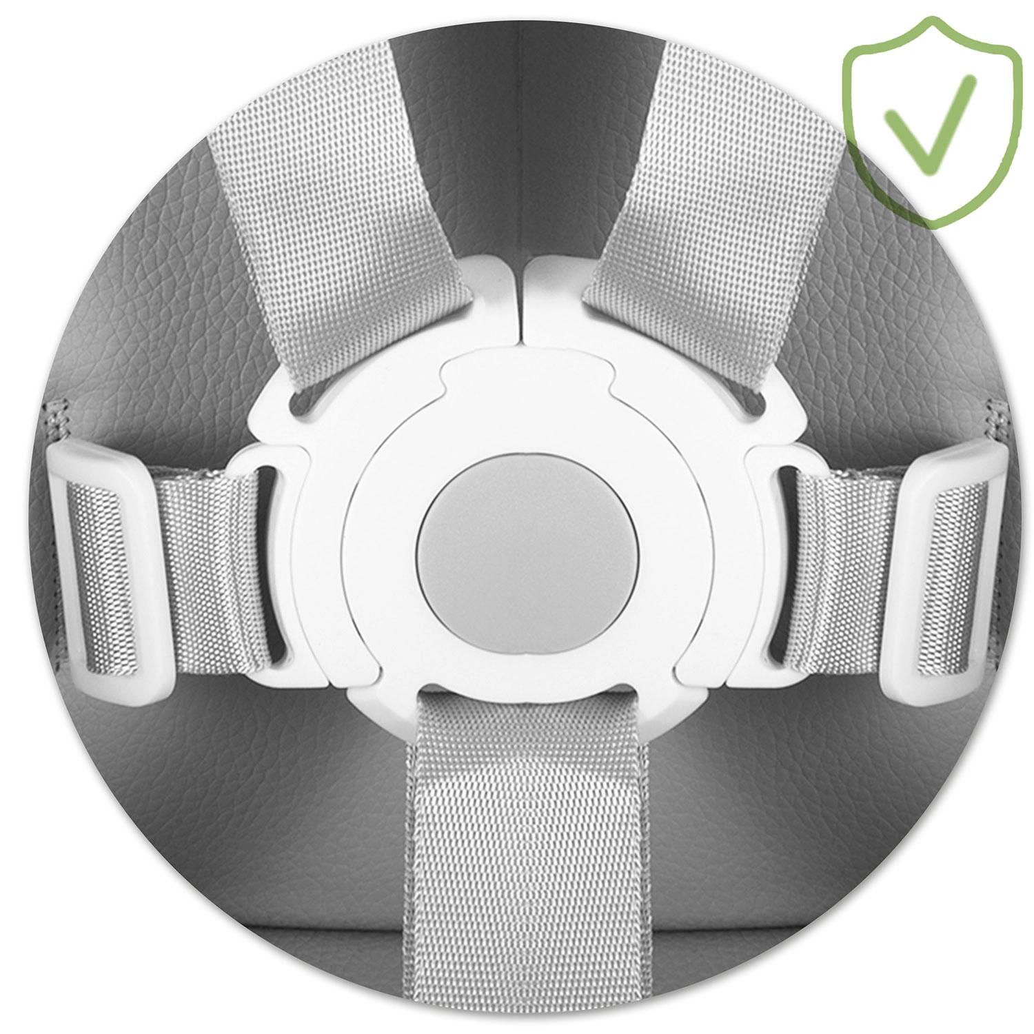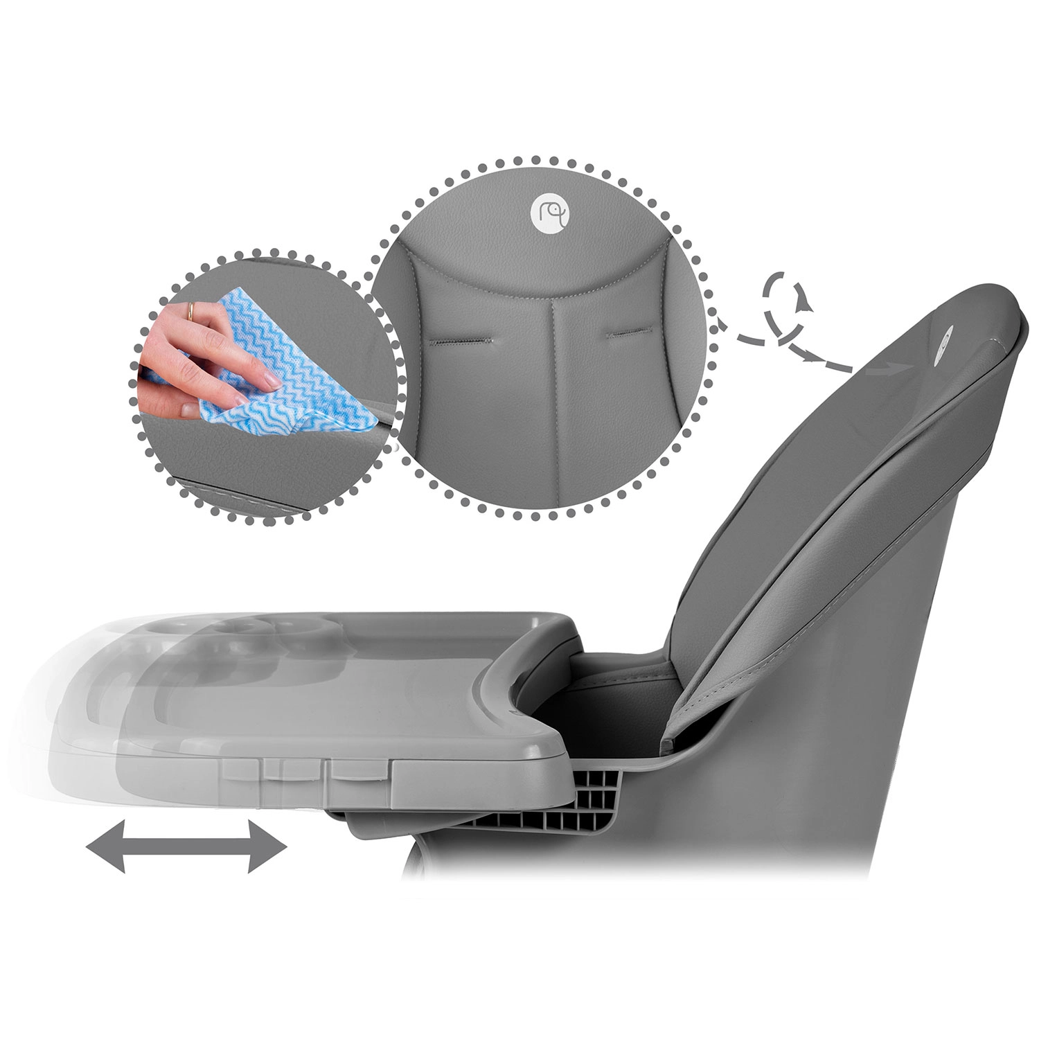 Pour une sécurité maximale, la chaise est équipée d’un harnais de sécurité 5 points, d’une large base stable avec embouts antidérapants et d’un repose-pieds solide pour une posture correcte. Le plateau peut être rapproché/éloigné et entièrement retiré si nécessaire afin que l’enfant puisse s’asseoir directement à la table à manger.