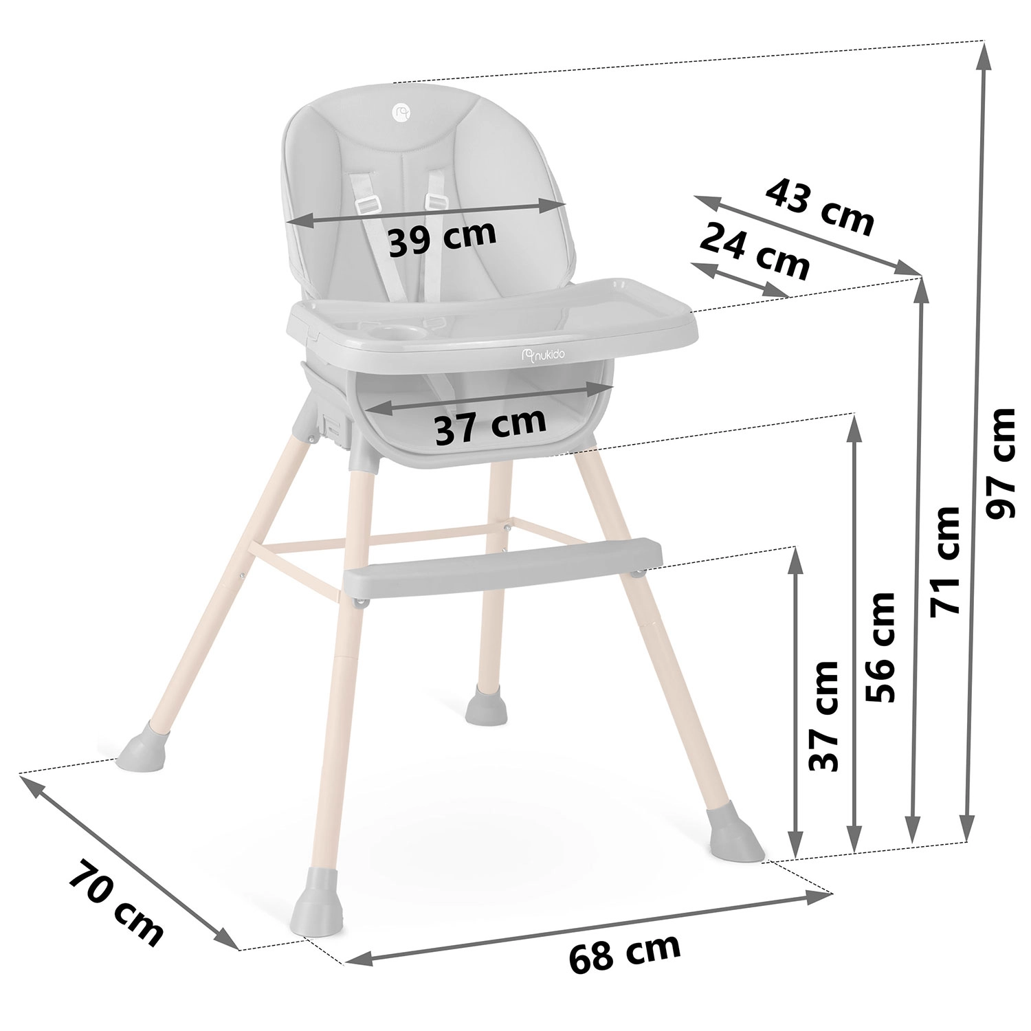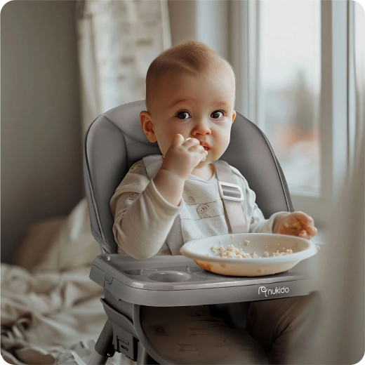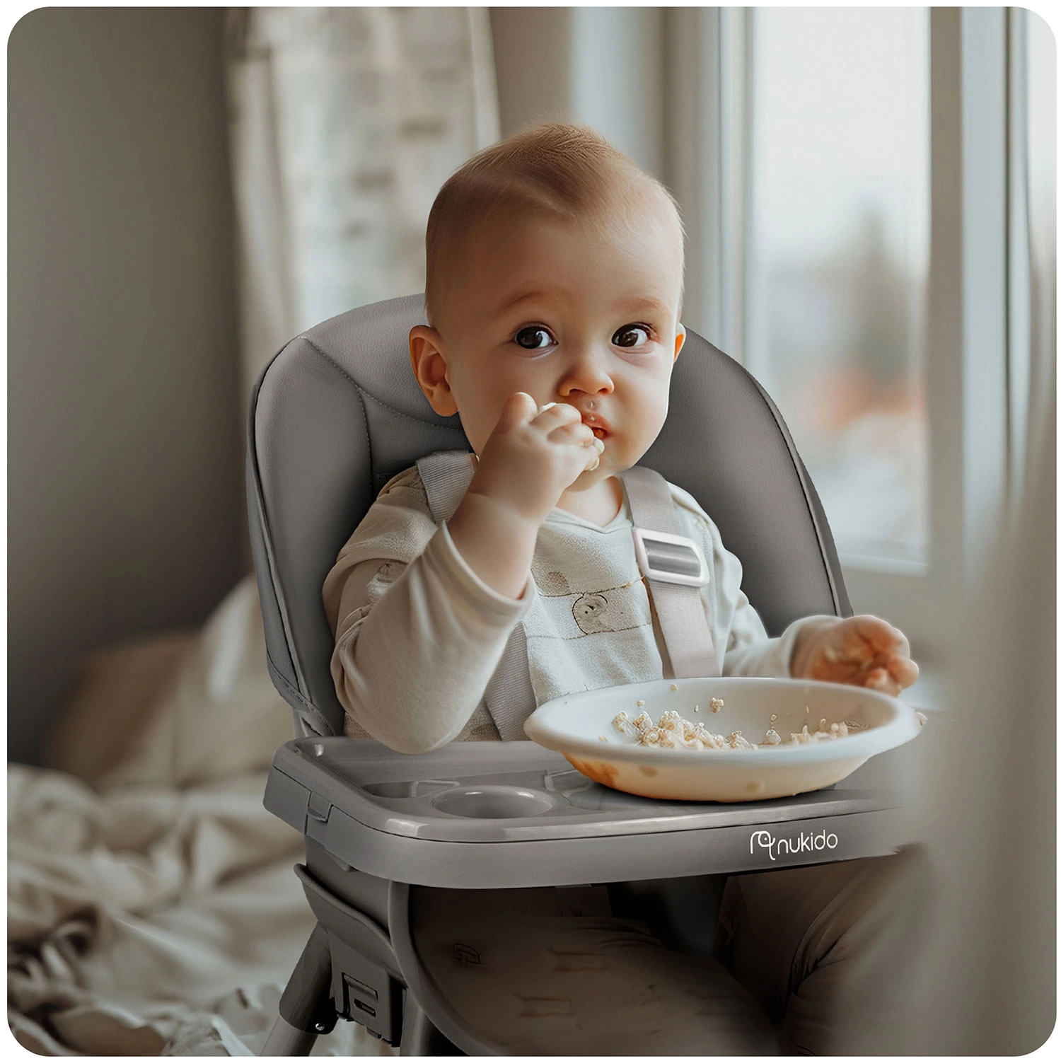 Pratique et sûre, la chaise haute NUKIDO Tilo 3-en-1 en élégant coloris gris accompagne votre enfant dès 6 mois. Elle offre un plateau amovible et réglable, des matériaux faciles à nettoyer et un harnais de sécurité 5 points. Grâce à ses pieds stables avec embouts antidérapants et à un repose-pieds solide, elle est idéale non seulement pour les repas, mais aussi pour jouer, dessiner et les premières lectures.