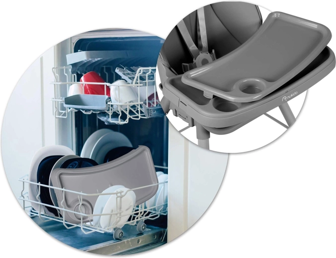 L’insert amovible du plateau avec bord relevé retient les salissures et se rince sous l’eau courante ou se met au lave-vaisselle. La surface de l’assise est non absorbante.