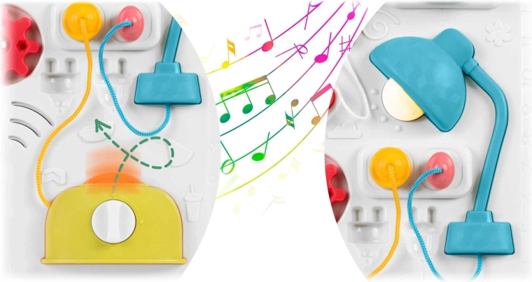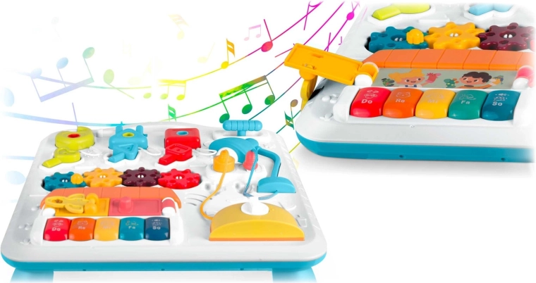 La table et le panneau pour enfants multifonctions réunis en un seul produit soutiennent le développement sensori-moteur et l’apprentissage par le jeu. Grâce au panneau amovible, l’enfant peut l’utiliser pour jouer debout ou comme panneau sensoriel portable au sol ou en voyage. Une riche palette d’éléments — petit piano avec tonalités et sons d’animaux, lampe qui s’allume, molettes, curseurs, « grille-pain » coulissant, petite maison avec porte et trois serrures avec clés — favorise la coordination œil-main, la logique et la reconnaissance des formes.