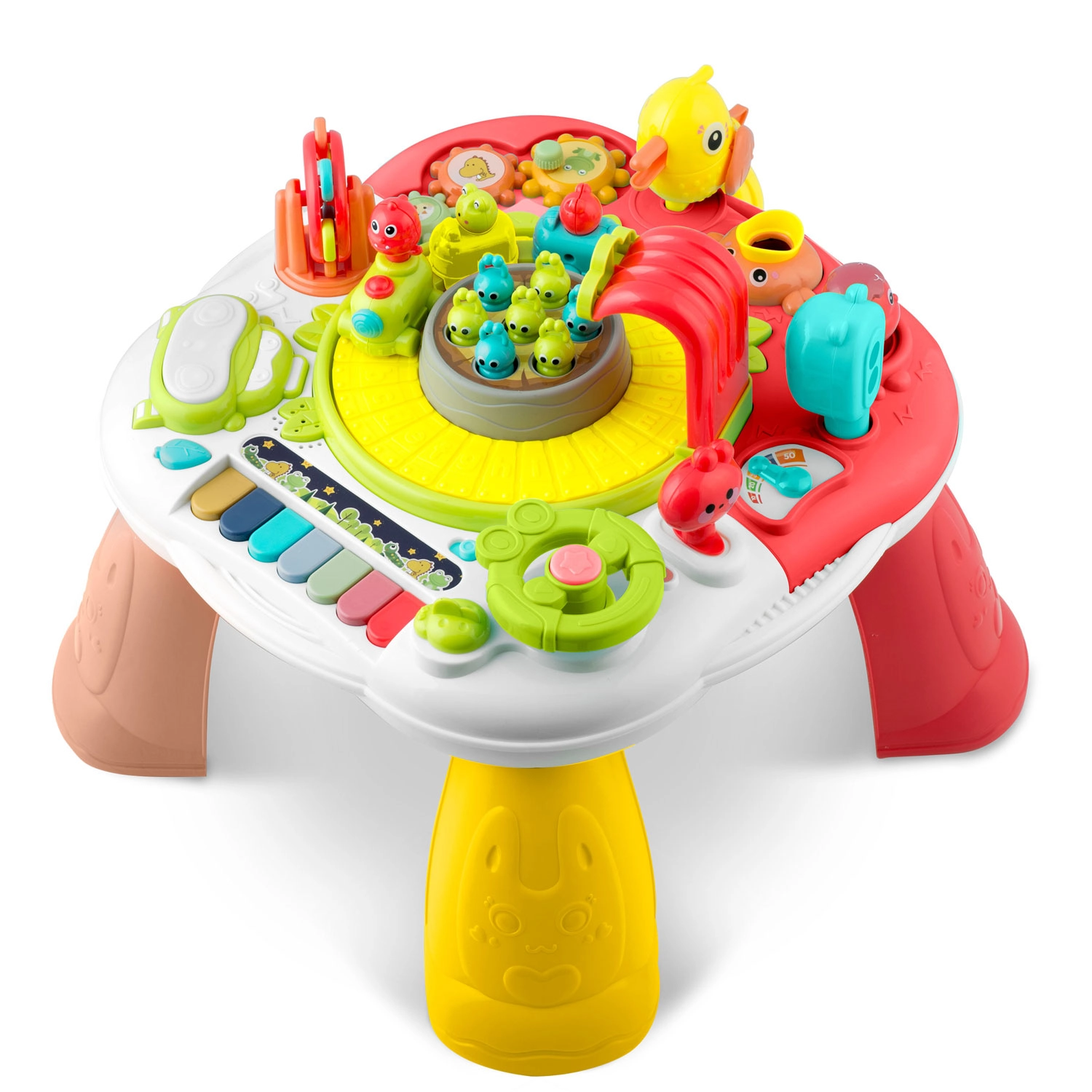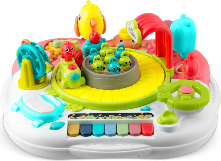 La table interactive et le tableau réunis en un seul produit allient amusement et apprentissage. Le panneau amovible peut être utilisé au sol ou, une fois les pieds installés, comme table autoportante. L’enfant profite des lumières, de la musique, des éléments mobiles et du petit piano tout en entraînant la coordination œil–main et en apprenant les couleurs ainsi que la relation cause–effet.