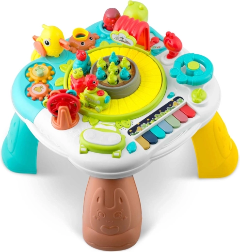Un compagnon ludique et malin pour les enfants dès 18 mois : une table interactive avec panneau amovible faisant aussi office de tableau éducatif. Elle propose des éléments lumineux et sonores, un petit piano coloré, un petit train automatique, un manège rotatif, des rouages et toute une série de boutons et leviers pour développer la motricité fine, la logique et l’apprentissage des couleurs. Sa construction stable, son montage rapide et la régulation du volume à deux niveaux plairont aux enfants comme aux parents.