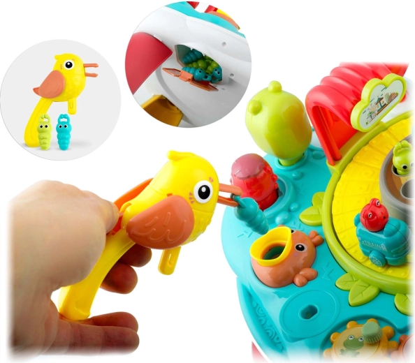 Le set comprend aussi un petit train automatique qui se déplace tout seul et capte l’attention, un manège et une petite voiture lumineuse. Le jeu « nourrir l’oisillon avec des vers » favorise la préhension et la précision. Les parents apprécieront la possibilité de couper complètement le son et les 2 niveaux de volume, ainsi que la fabrication solide et le montage facile.