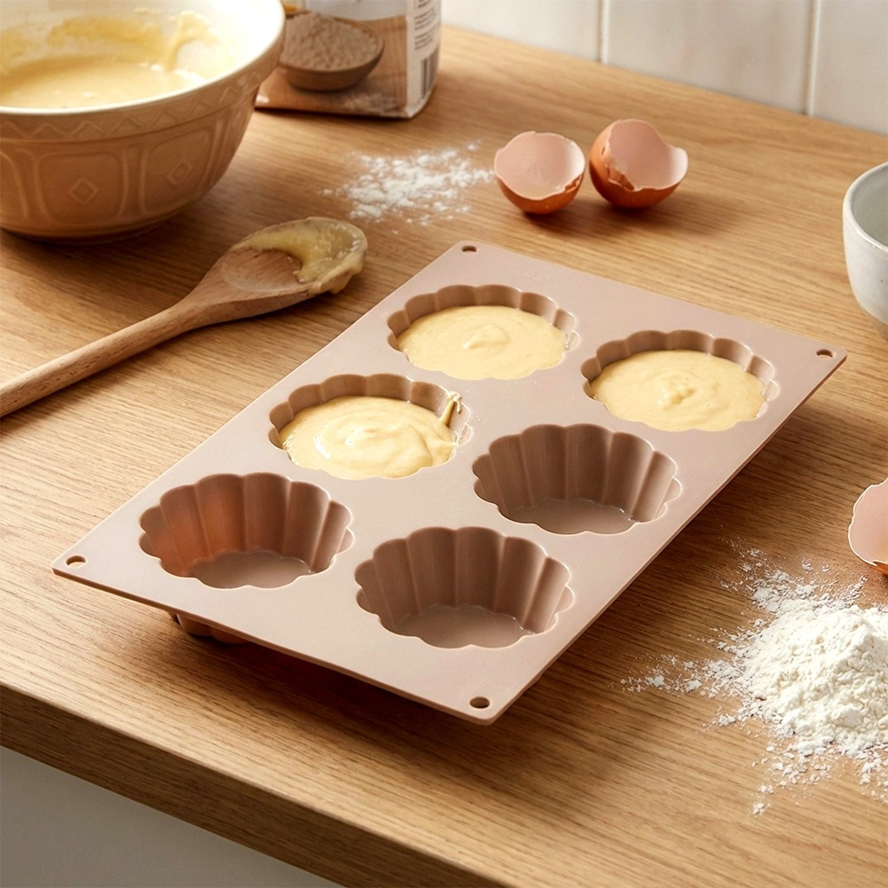 Pratique, ce moule de cuisson en silicone avec 6 cavités en forme de fleur vous permet de préparer des biscuits maison, muffins, pralines et mini desserts. Grâce à son matériau flexible, la pâte ne colle pas et les desserts se démoulent facilement. Le moule est résistant aux températures de -40 °C à +200 °C, compatible four, micro-ondes et congélateur, et passe au lave-vaisselle.