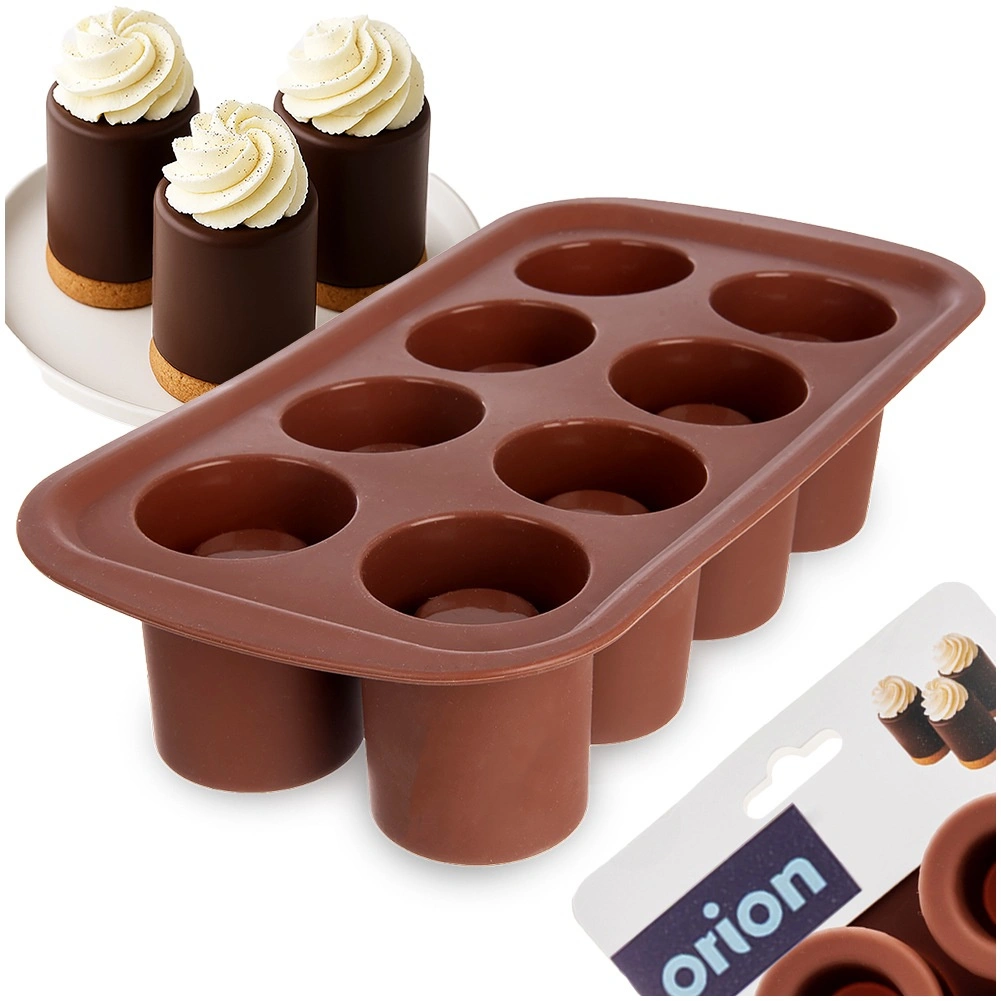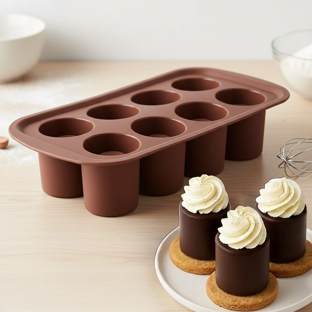 Moule en silicone avec 8 cavités profondes pour la préparation facile de biscuits fourrés, mini gâteaux et coupelles en chocolat. Résistant de -40 °C à +200 °C, compatible avec le four, le micro-ondes, le réfrigérateur et le congélateur, et lavable au lave-vaisselle. Le silicone antiadhésif et flexible garantit un démoulage facile et une forme parfaite avec un orifice pour la garniture.