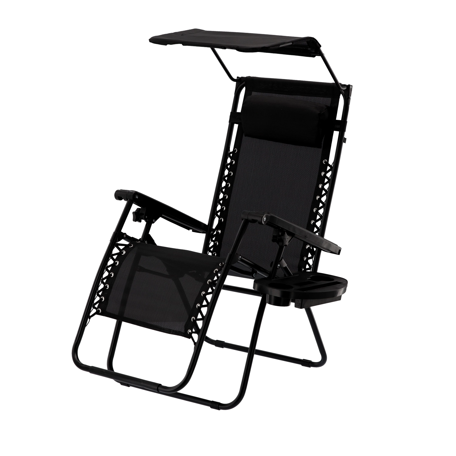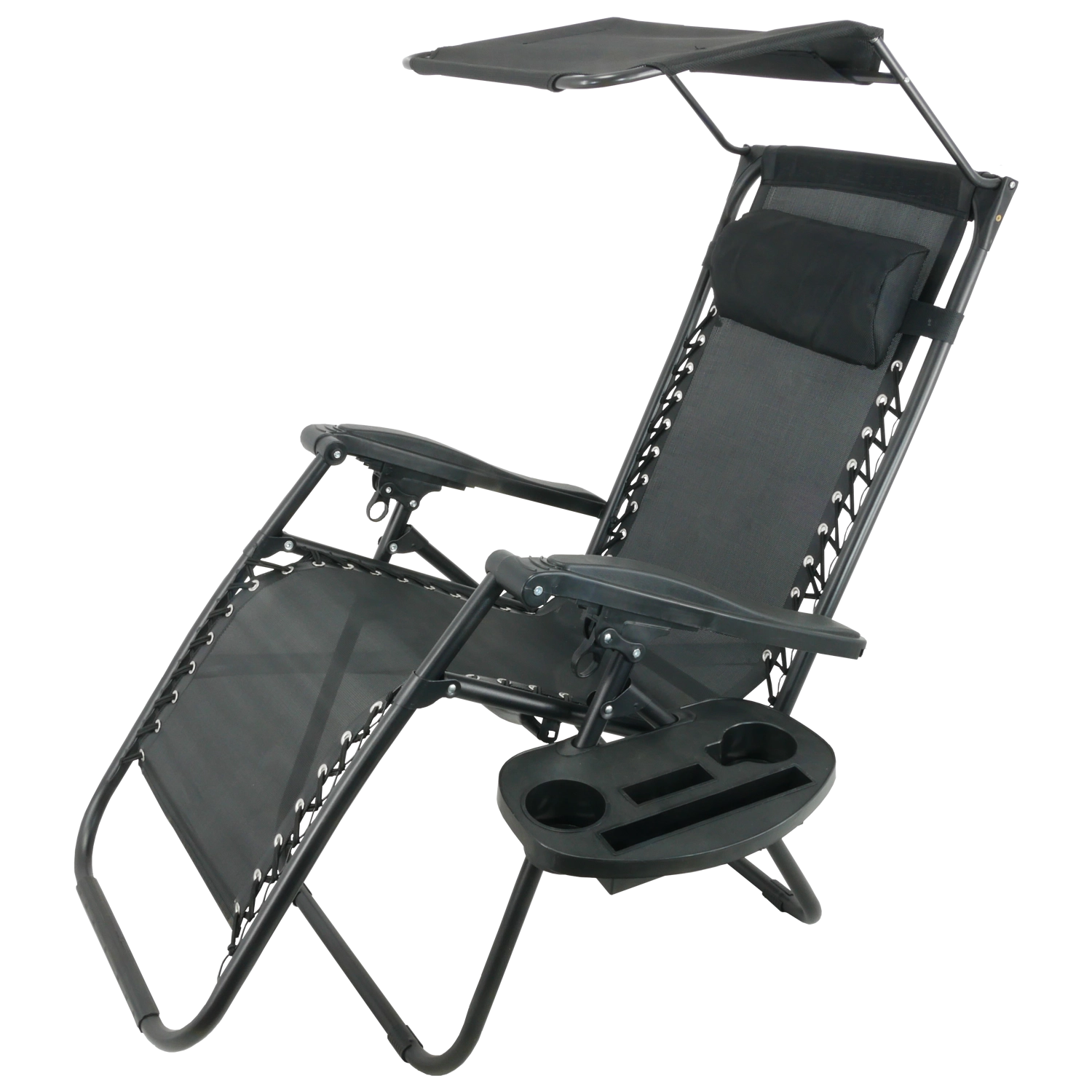 Chaise longue de jardin pliante avec auvent, tablette, poche et petit coussin – noire