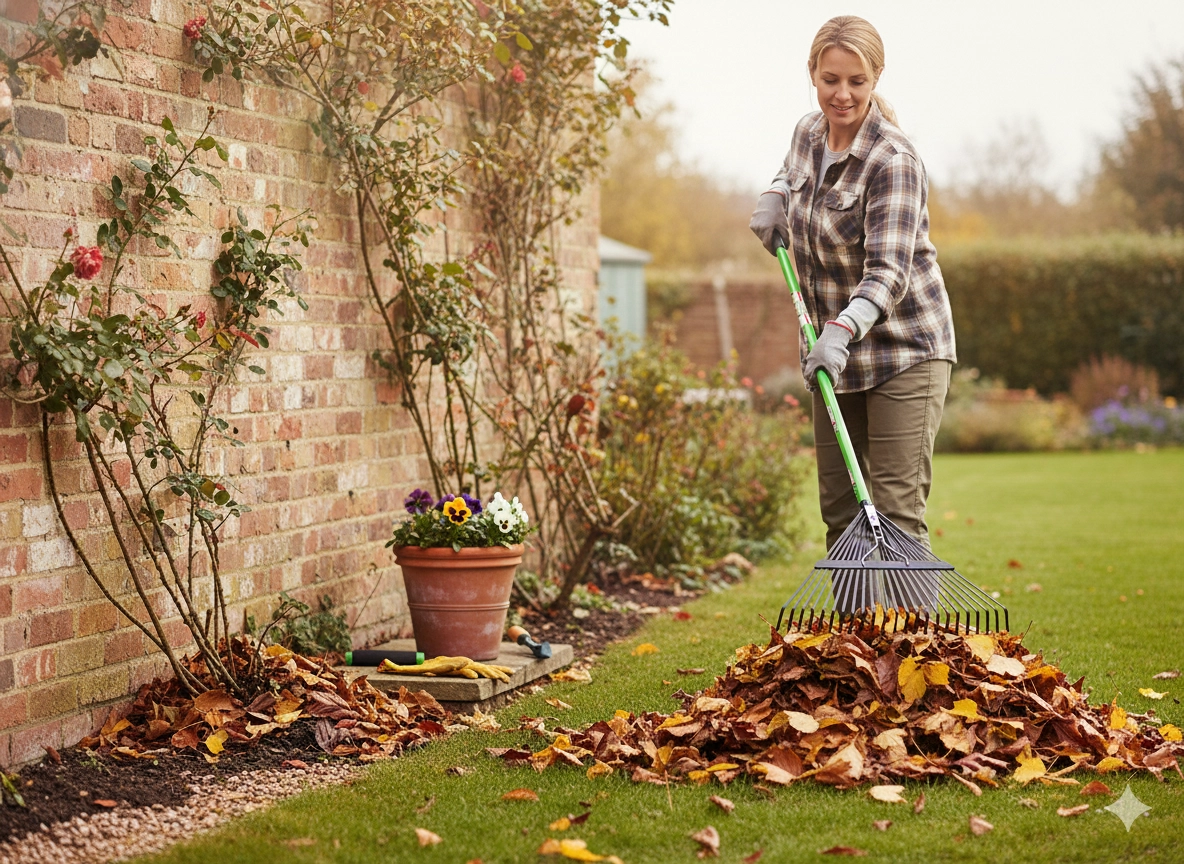 Ramassage des feuilles, de l’herbe et des déchets de jardin sur allées, massifs et pelouses
