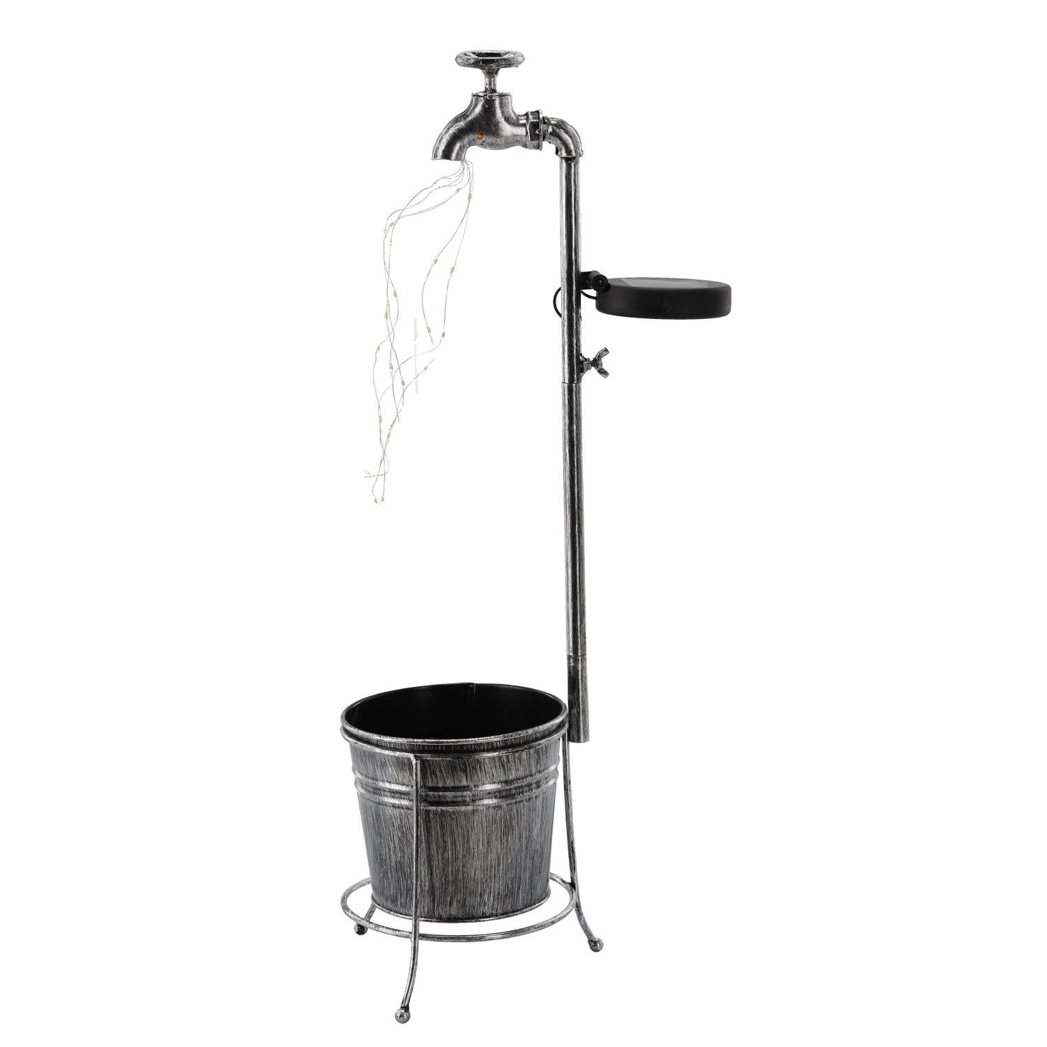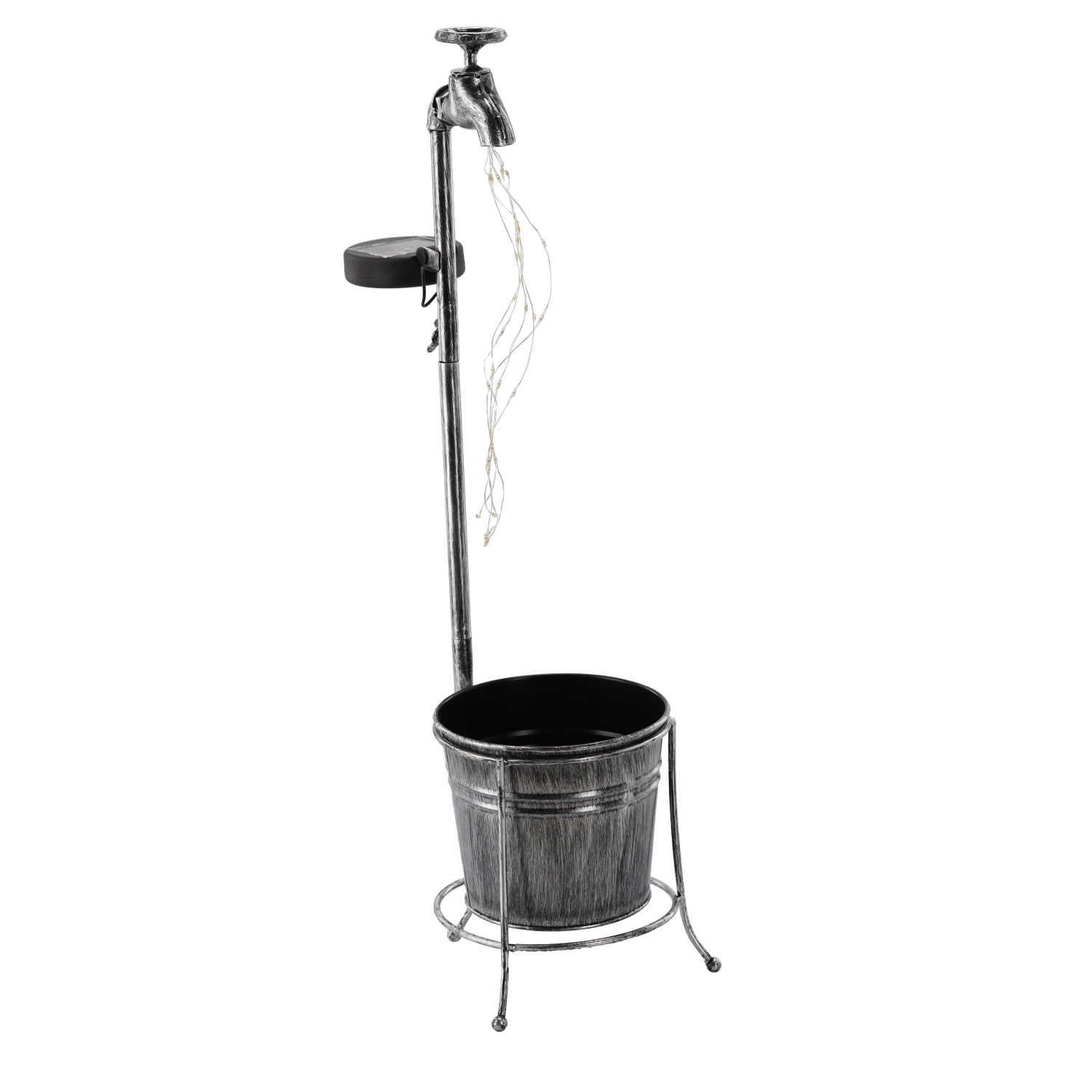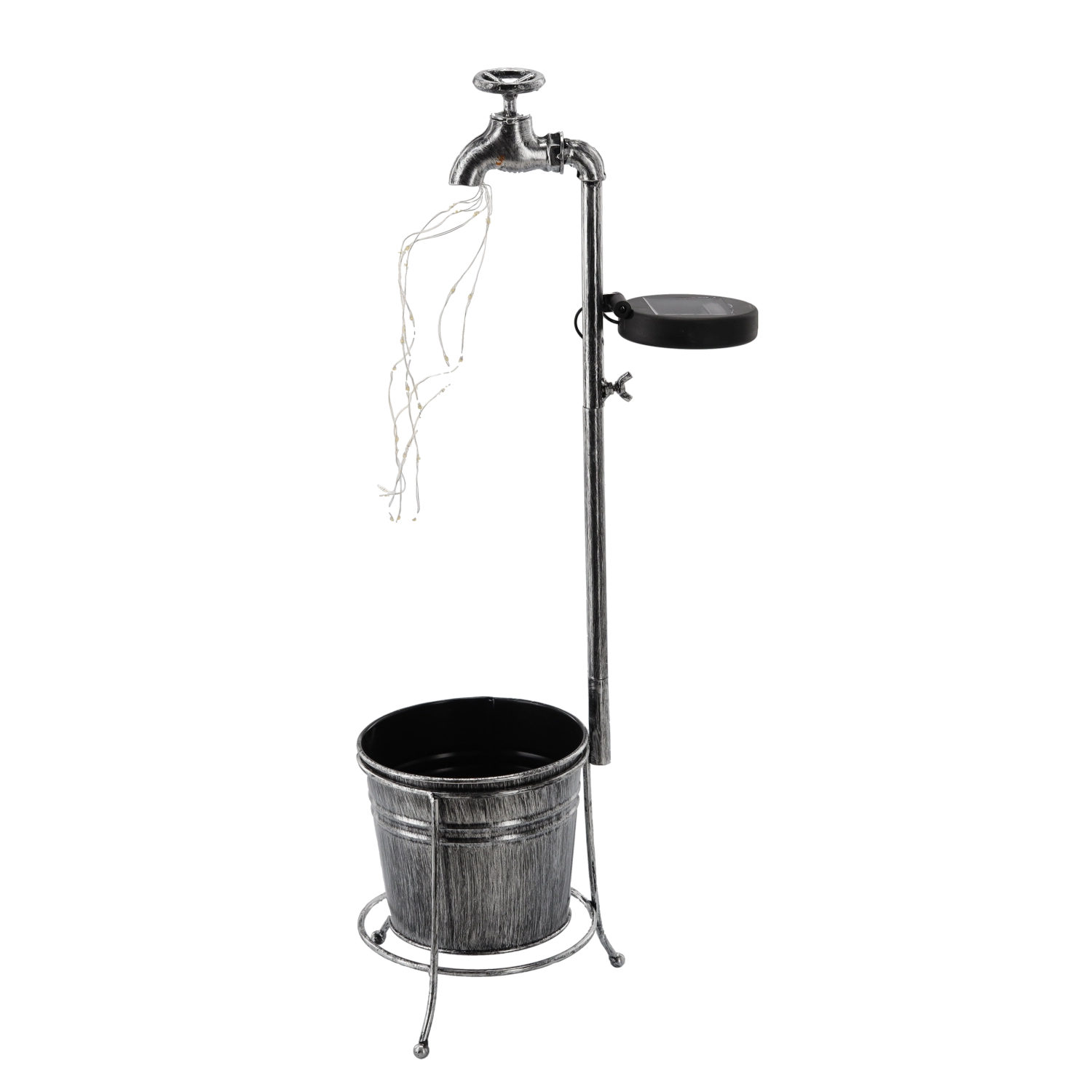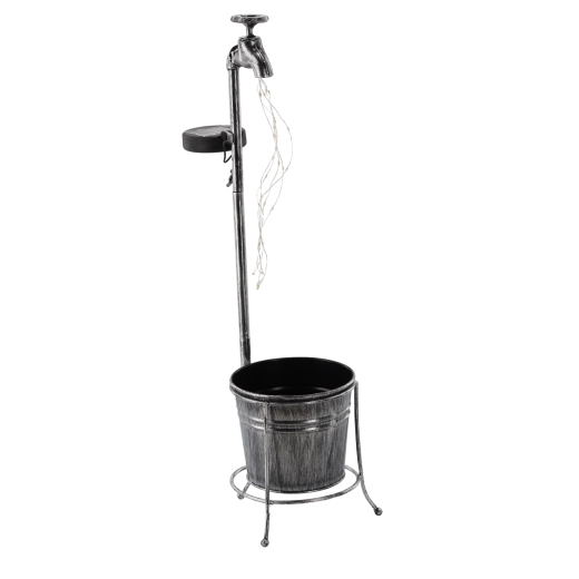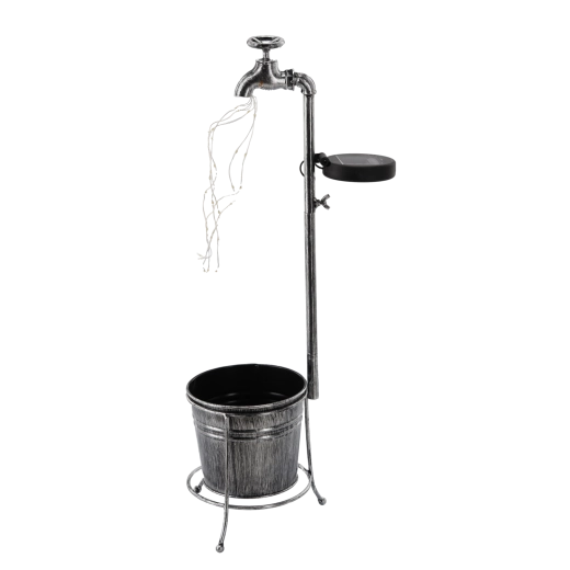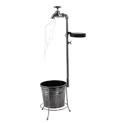 Cette lampe solaire design avec pied métallique et faux robinet évoque une petite fontaine lumineuse de jardin. Les « gouttes » lumineuses de 30 LED blanc chaud tombent dans un pot rustique et ajoutent une touche charmante et chaleureuse à la terrasse, au massif ou à l’entrée de la maison, sans électricité.