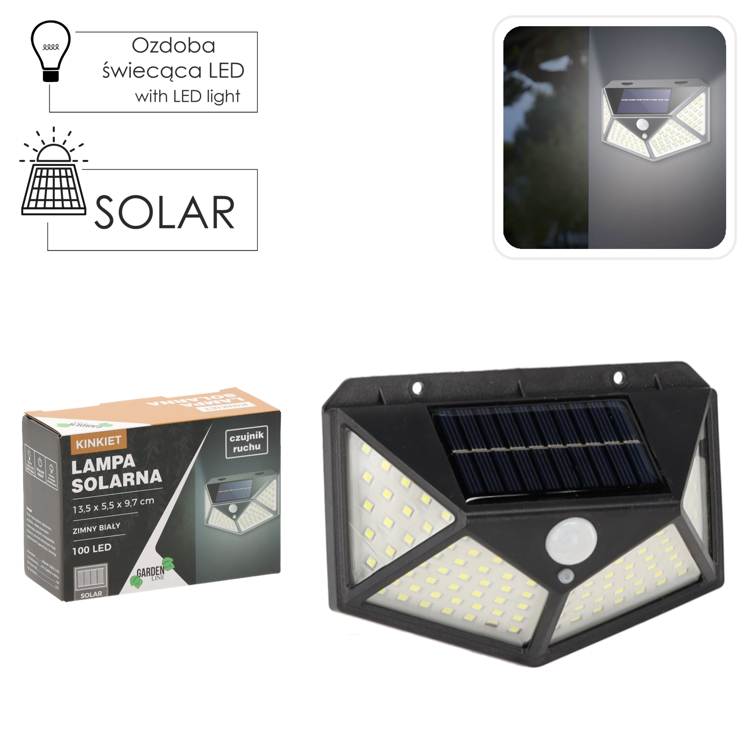 La matrice dense de 100 LED assure un rendement lumineux élevé en blanc froid, idéal pour sécuriser chemins, entrées et cours.