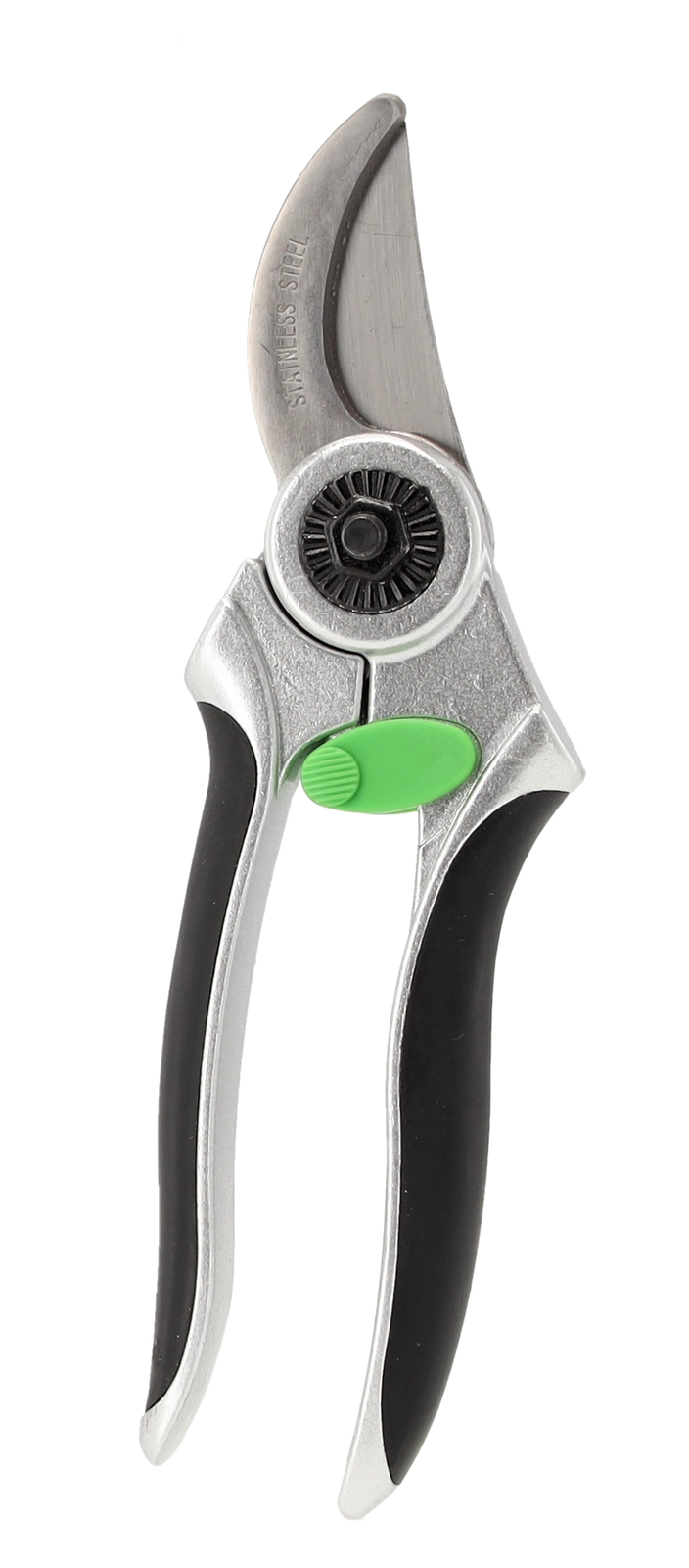 Sécateur bypass ergonomique avec verrou de sécurité, idéal pour des coupes précises de tiges et de petites branches. Poignées texturées pour une prise en main sûre.