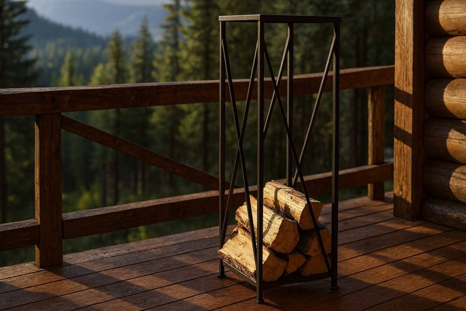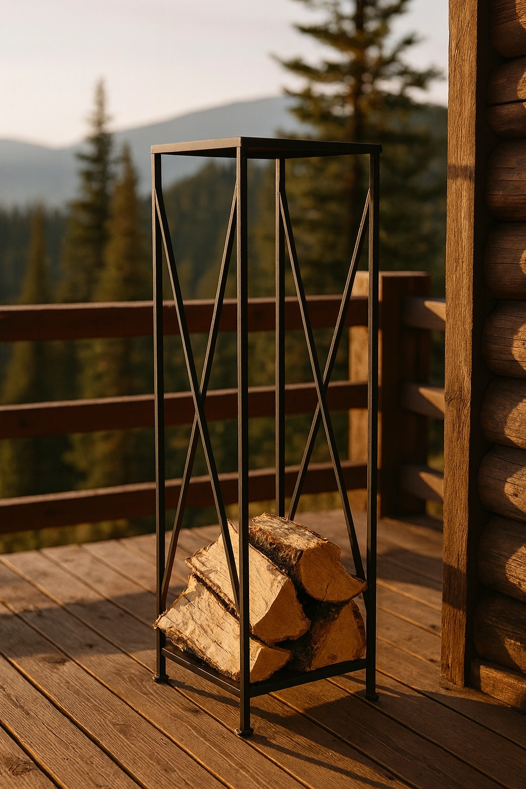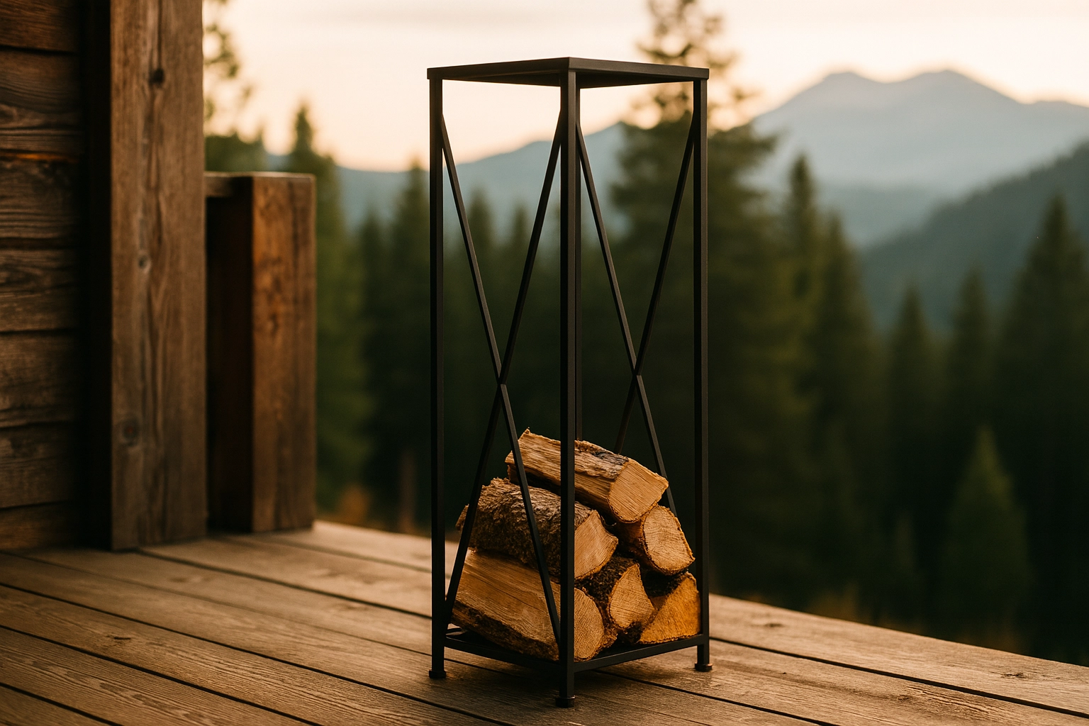 Le cadre vertical aux côtés ouverts accueille beaucoup de bois sans encombrer l’espace. Idéal près de la cheminée ou pour les petites terrasses.
