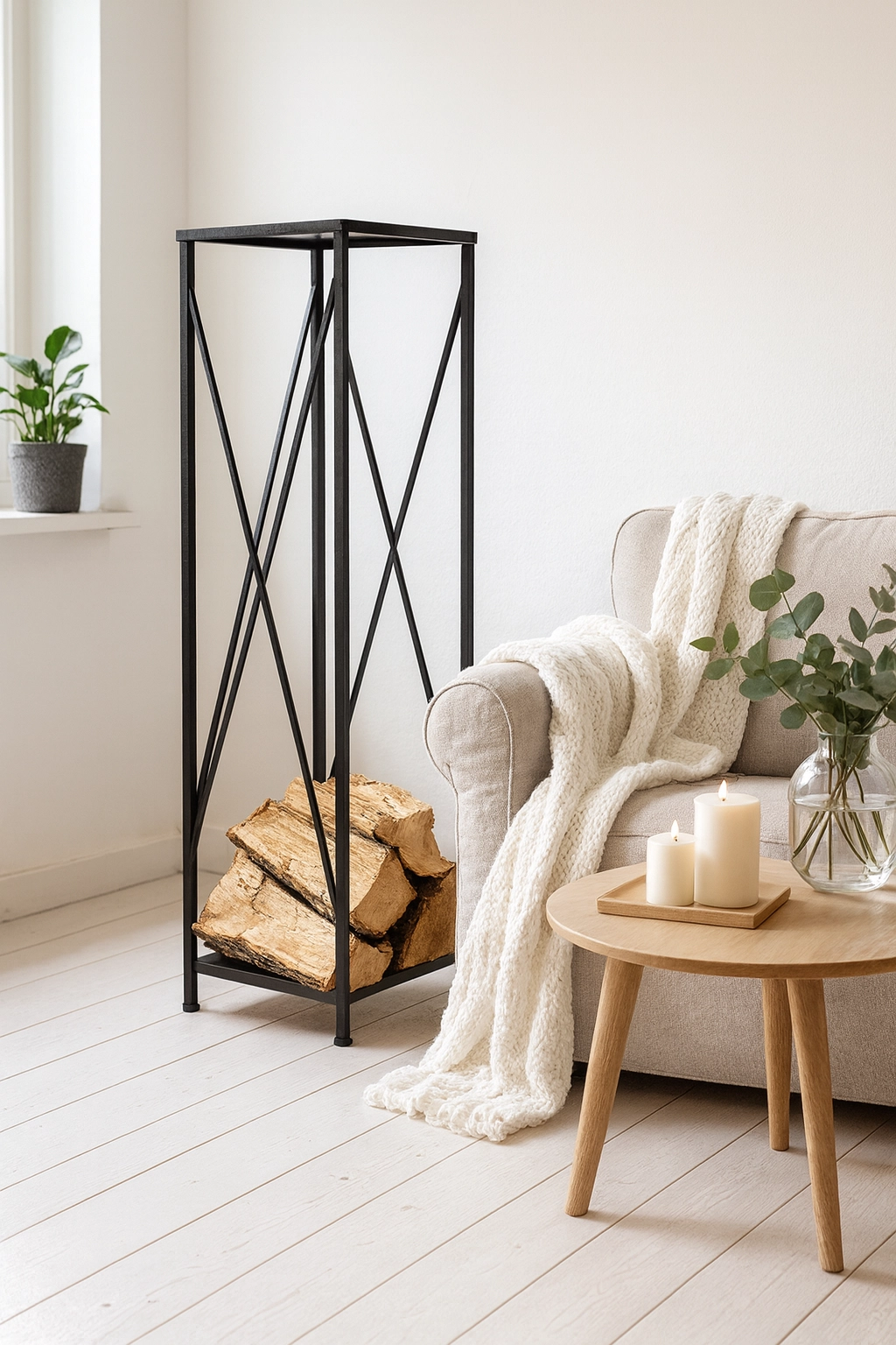 Un porte-bûches élégant et peu encombrant garde le bois à portée de main près de la cheminée. Grâce à sa structure en acier robuste, il offre une capacité de charge élevée jusqu’à 30 kg, une grande stabilité et une longue durée de vie. Son design moderne et élancé s’intègre à tout intérieur comme à une terrasse.