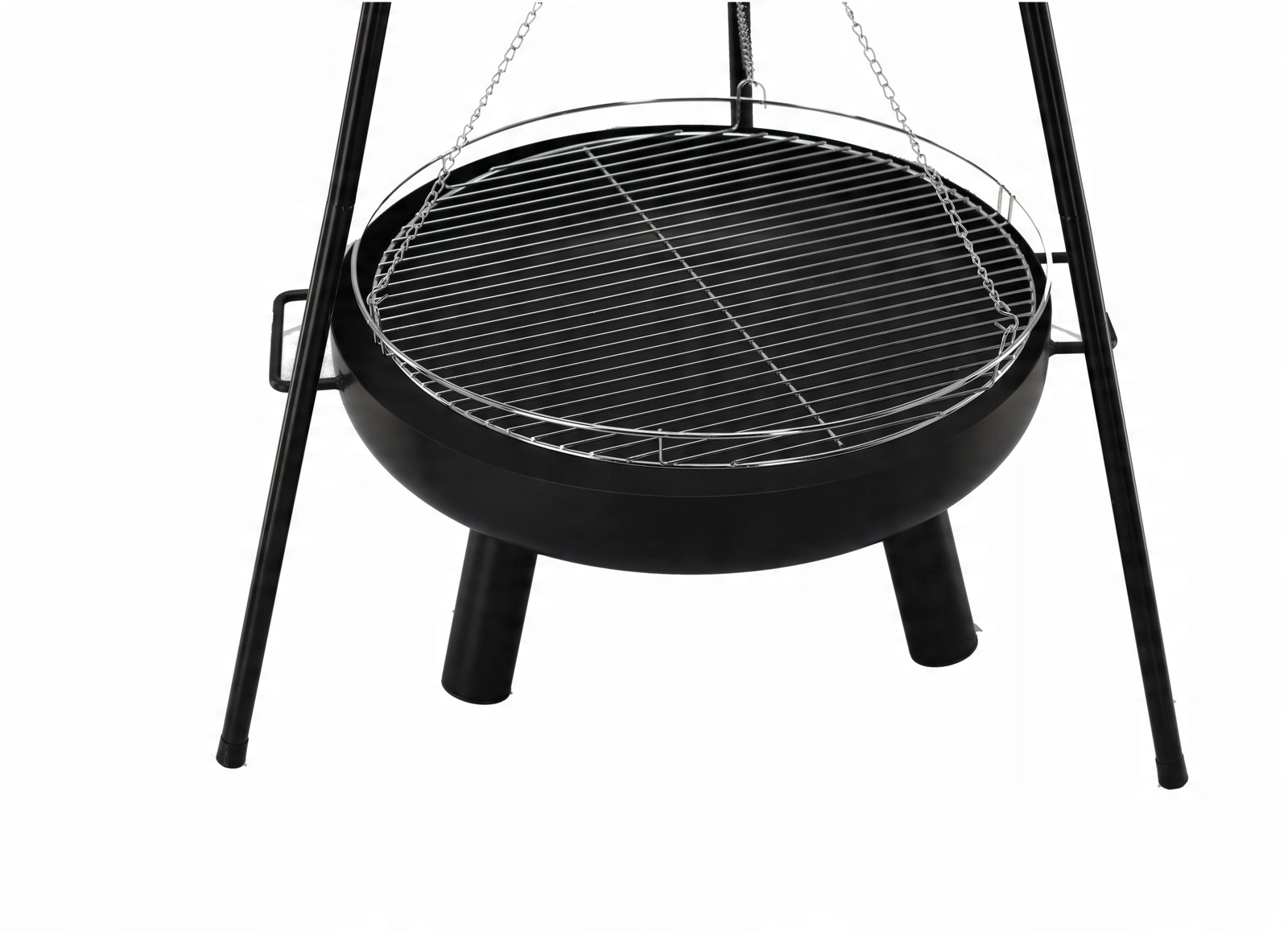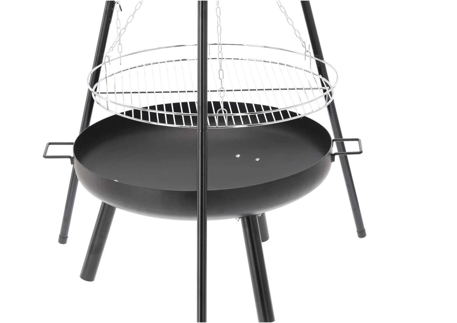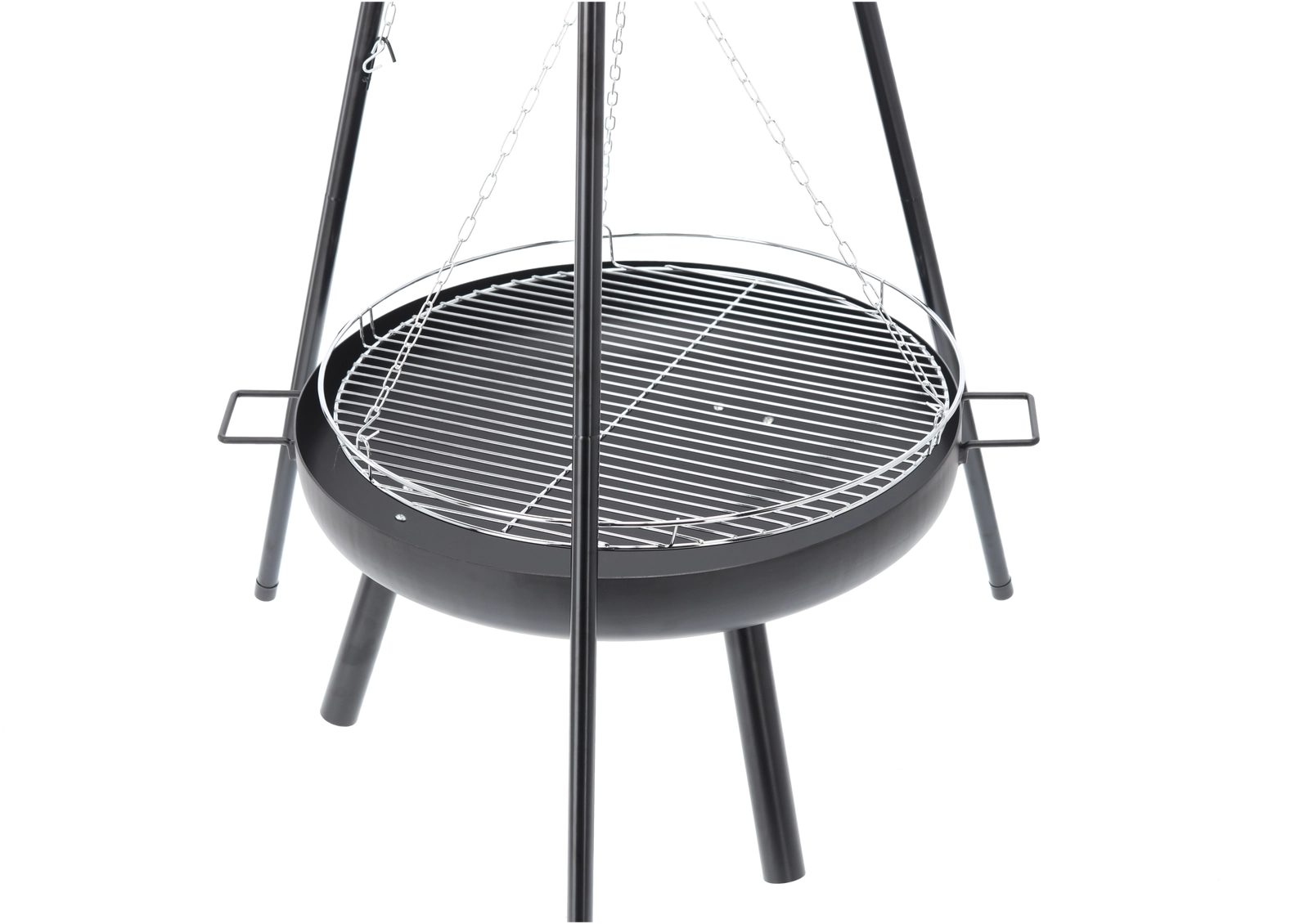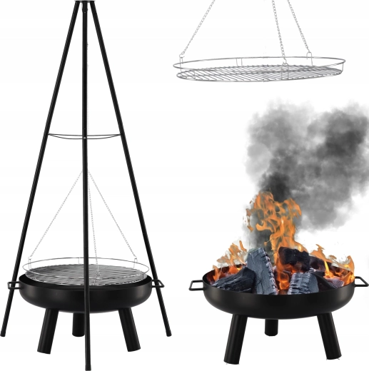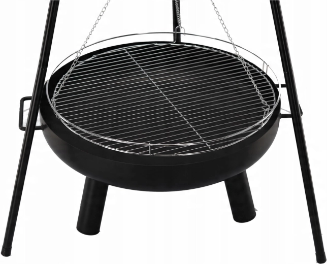 Solution 2‑en‑1 élégante : brasero et gril suspendu. Le bol en acier robuste de 2 mm d’épaisseur, avec une peinture noire résistante à la chaleur, garantit une longue durée de vie même en cas d’utilisation fréquente. Grâce à la grille suspendue sur chaînes, vous réglez aisément la distance au feu pour préparer viandes juteuses, légumes et brochettes exactement à votre goût.