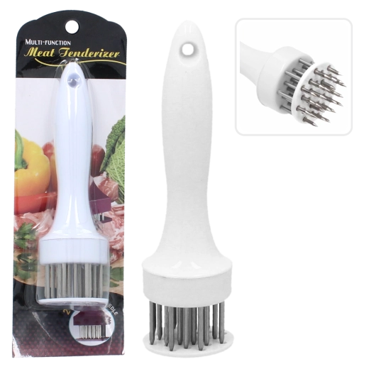 Pratique attendrisseur à viande en acier inoxydable avec poignée en plastique pour une utilisation confortable. Grâce aux aiguilles tranchantes, la marinade pénètre mieux, la viande sera après cuisson juteuse, aromatique et uniformément cuite. Sa conception légère garantit une manipulation aisée en cuisine comme au barbecue.