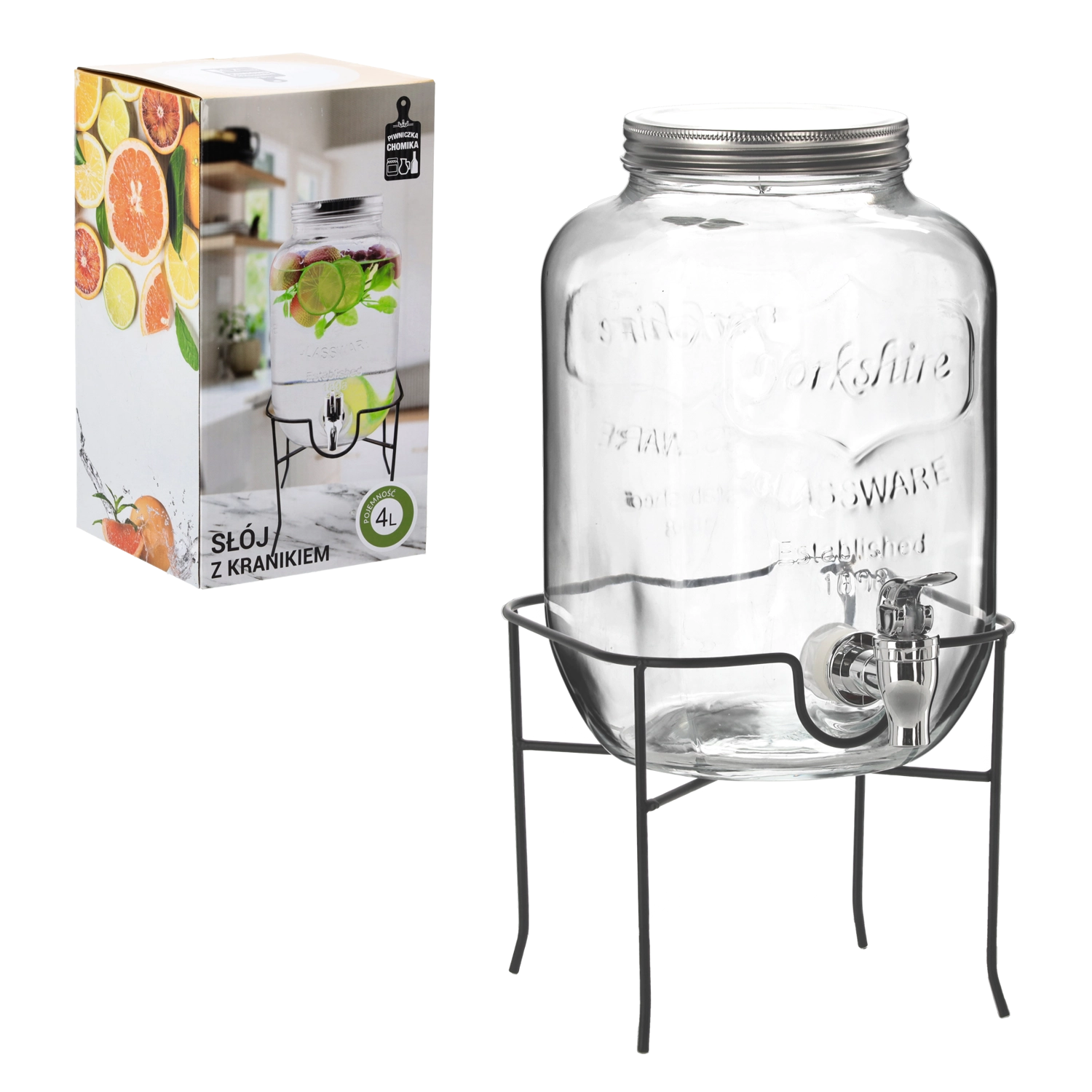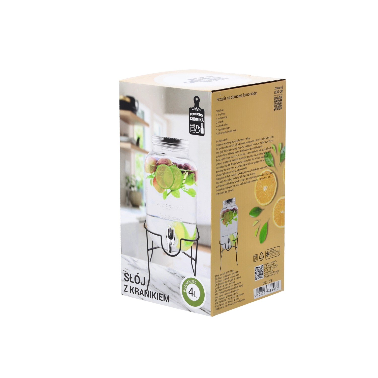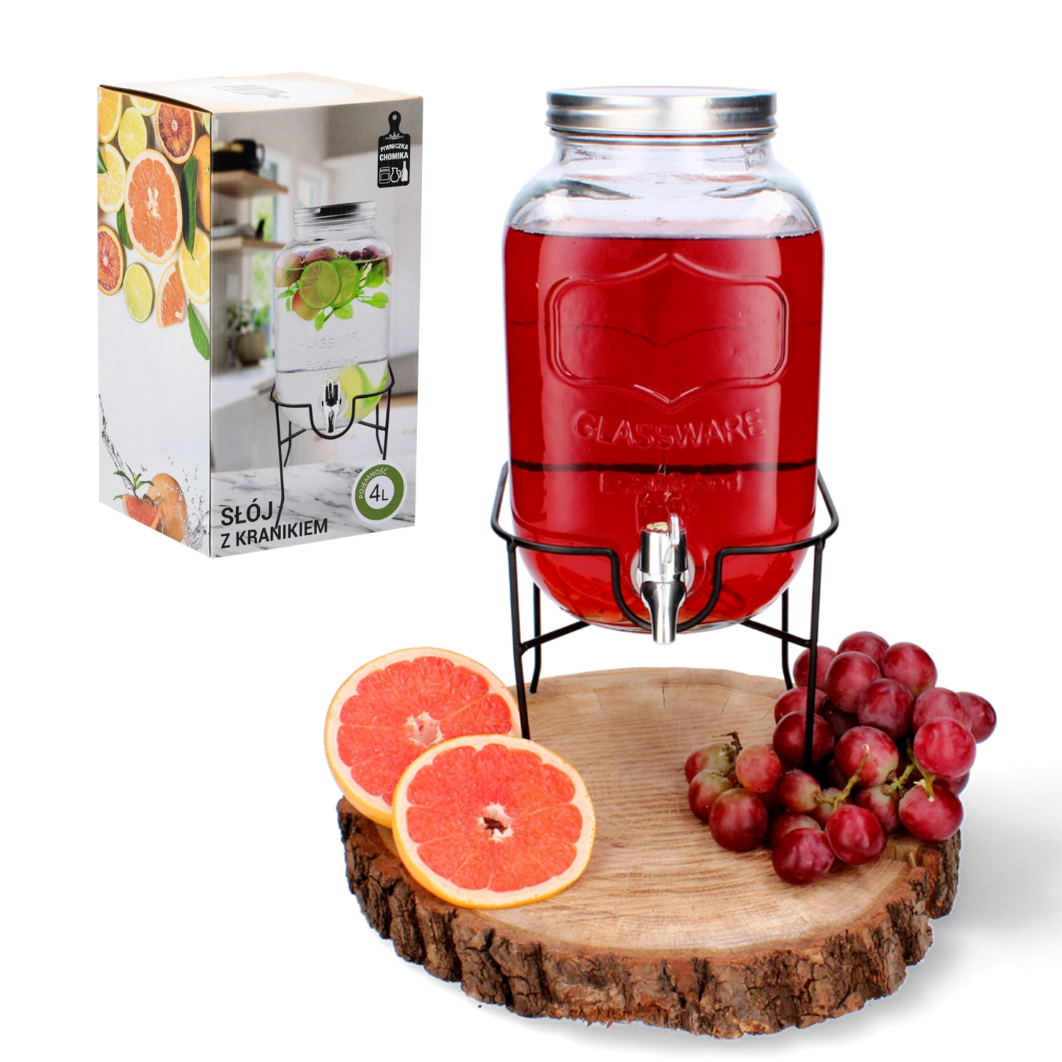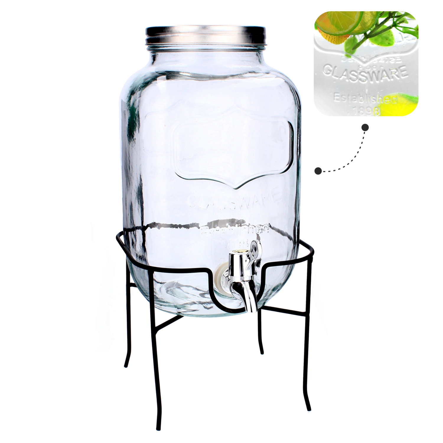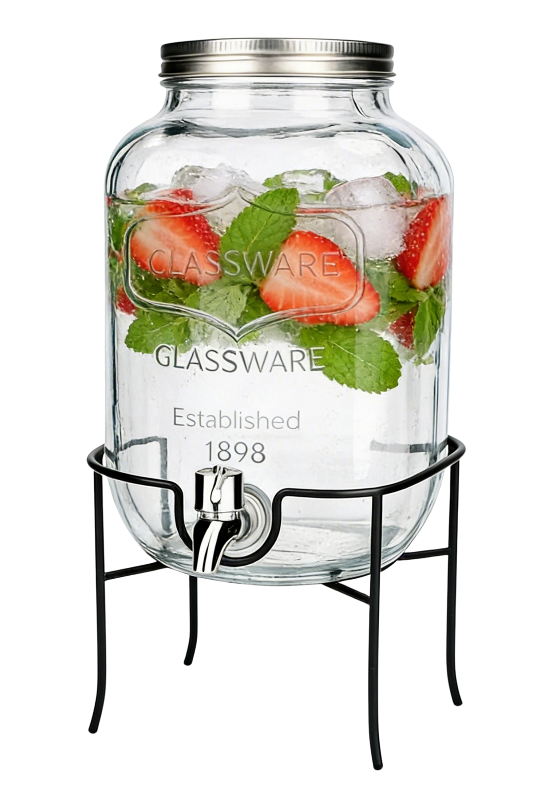 Le support métallique stable élève le récipient à une hauteur idéale pour verser facilement, même dans des verres ou carafes hauts. Le verre transparent convient aux eaux infusées aux fruits, limonades maison et thés glacés, et devient un élément décoratif de votre cuisine, salle à manger ou espace extérieur.