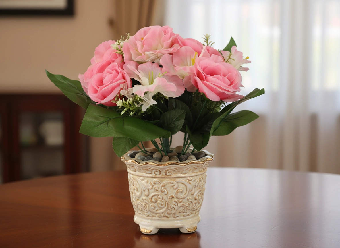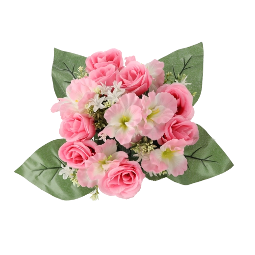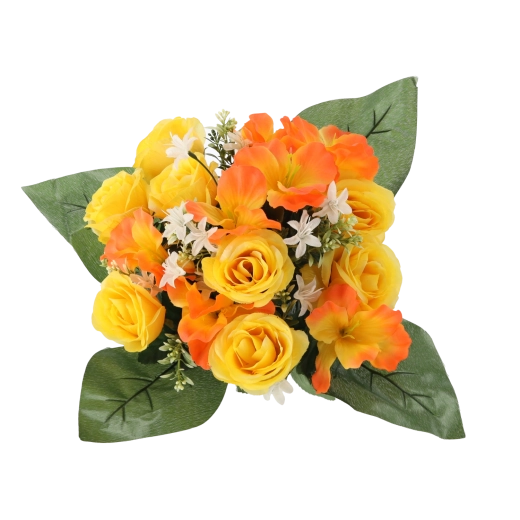 Apportez une touche florale rafraîchissante à la maison ou au bureau sans contraintes. Le bouquet artificiel avec roses et hibiscus se distingue par l’aspect fidèle des pétales et des feuilles, sa forme stable et des couleurs intenses qui ne ternissent pas. Son format compact est parfait pour une table, une commode, une réception ou un lieu de souvenir.