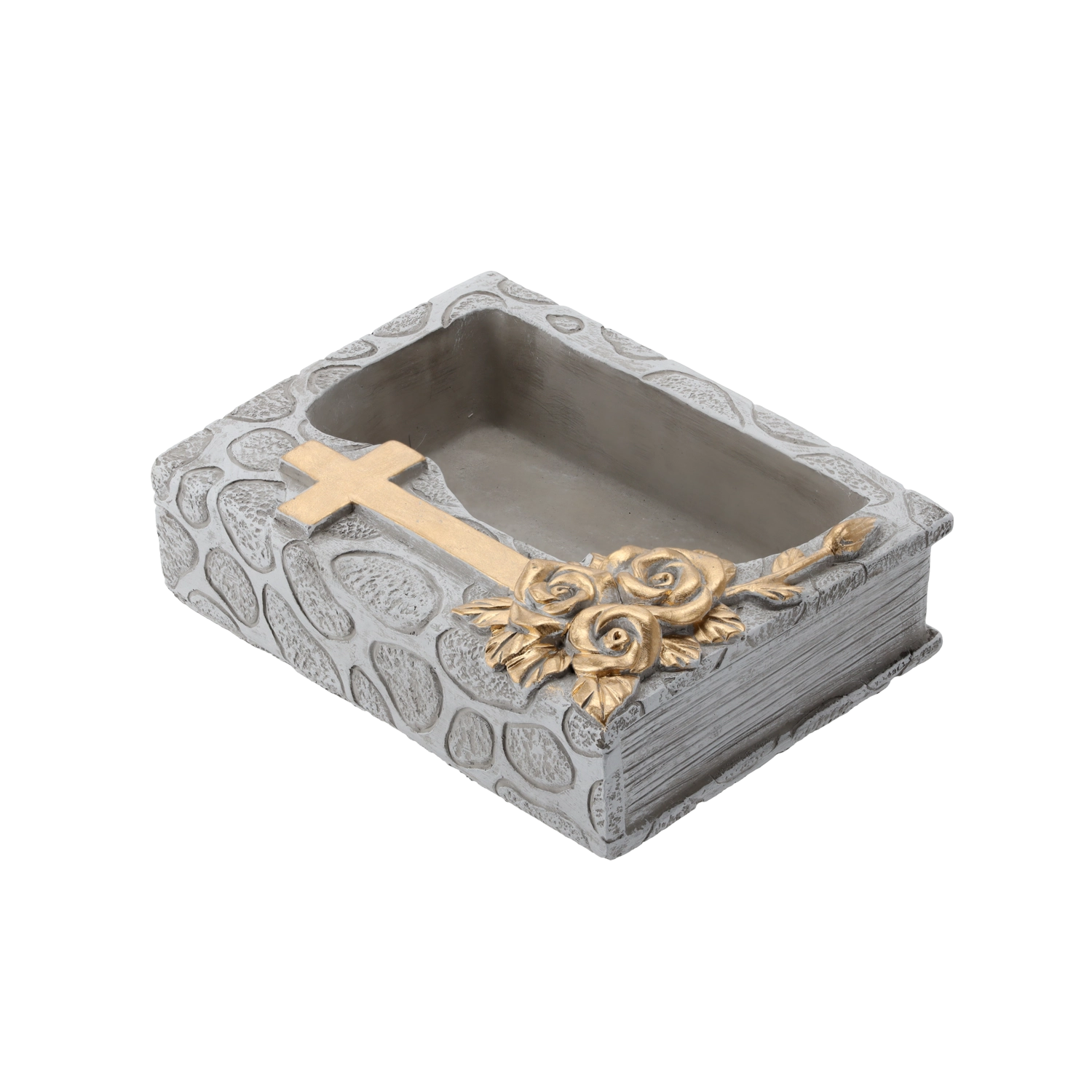 Élégante jardinière funéraire en forme de livre fermé avec croix décorative. Fabriquée en ciment résistant, de couleur grise avec des détails dorés qui apportent dignité et style aux compositions sur la tombe. Structure solide, finition élégante gris-or et base idéale pour les compositions florales.
