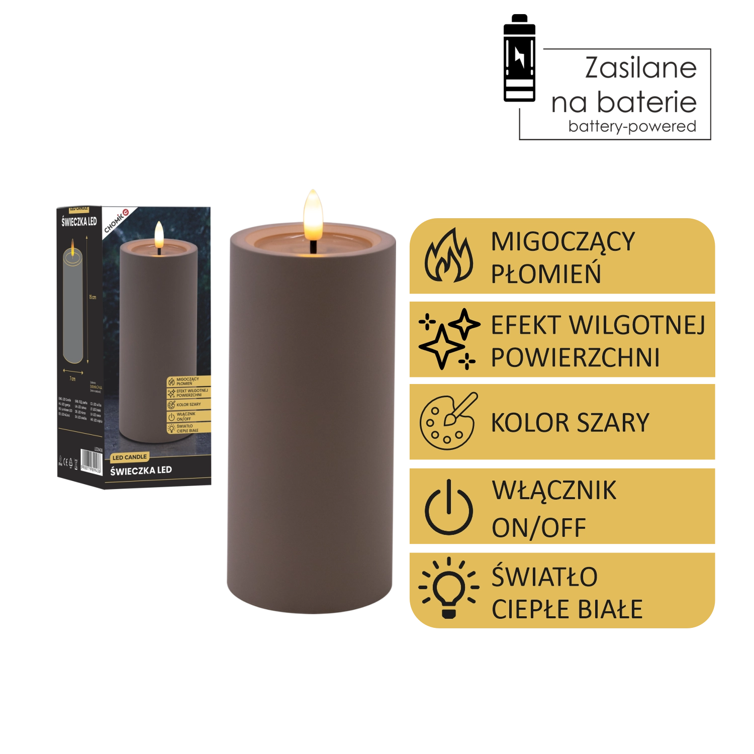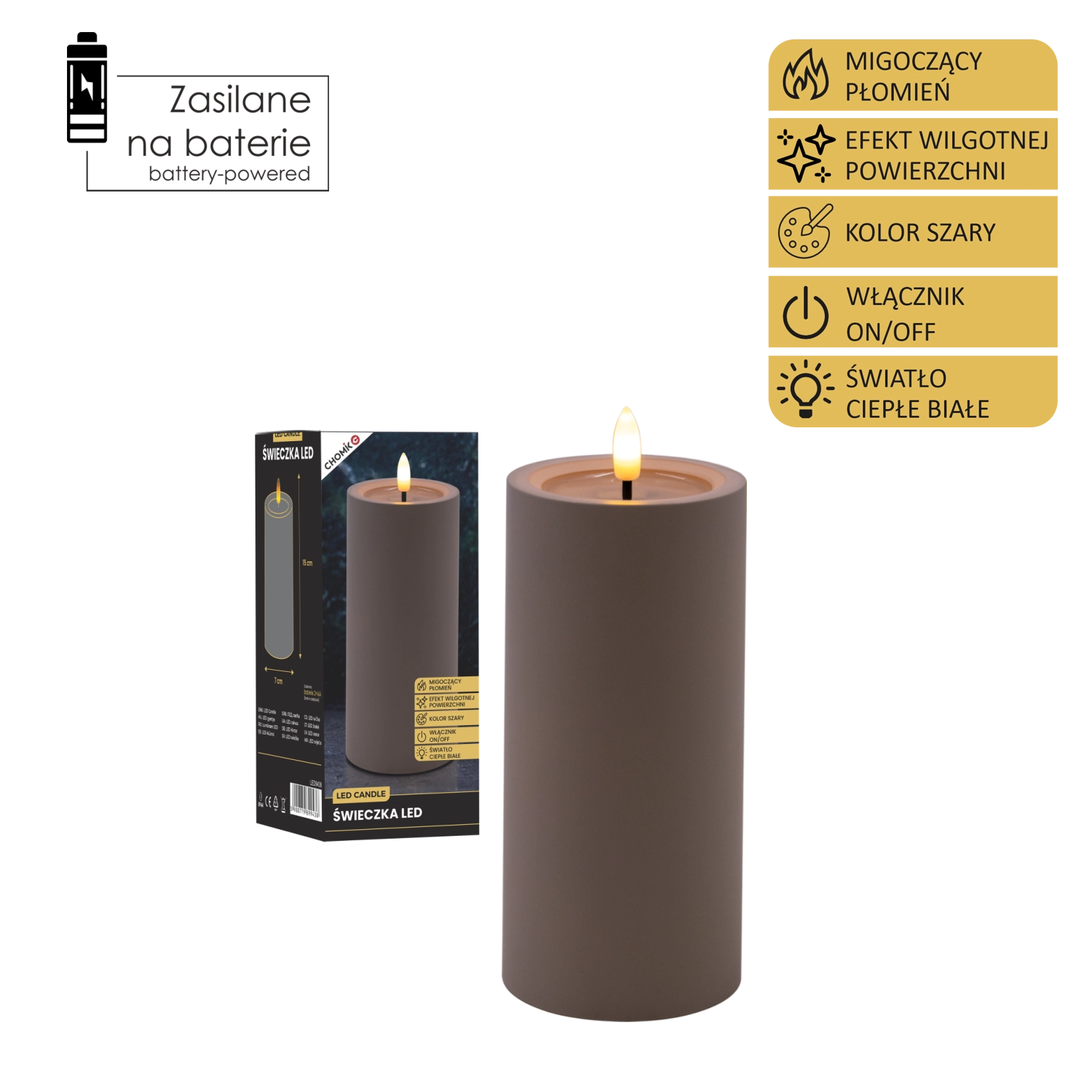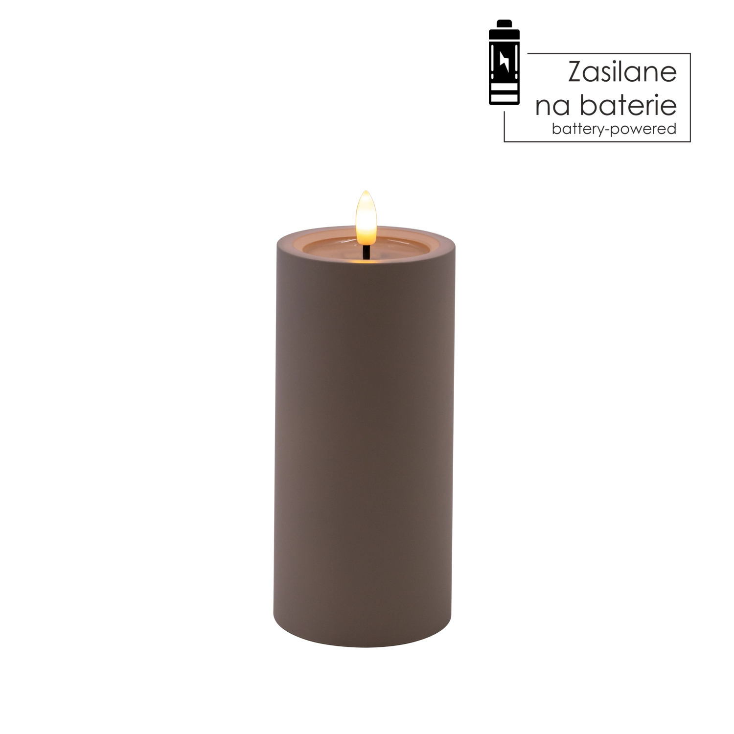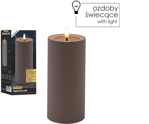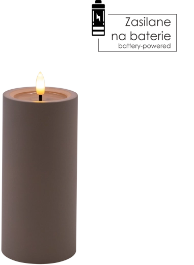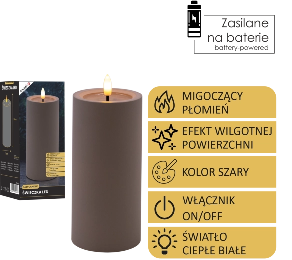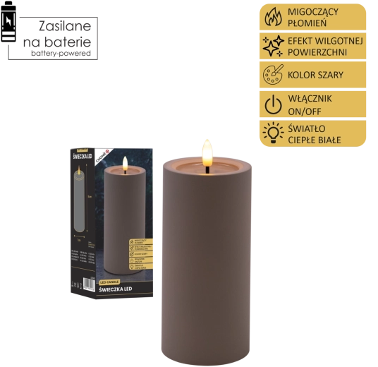 Bougie LED décorative de couleur grise avec une flamme vacillante réaliste en blanc chaud et un effet de bord supérieur humide. Parfaite pour compléter votre intérieur et créer une atmosphère chaleureuse sans fumée ni suie. Alimentation par 2× piles AA (non incluses).