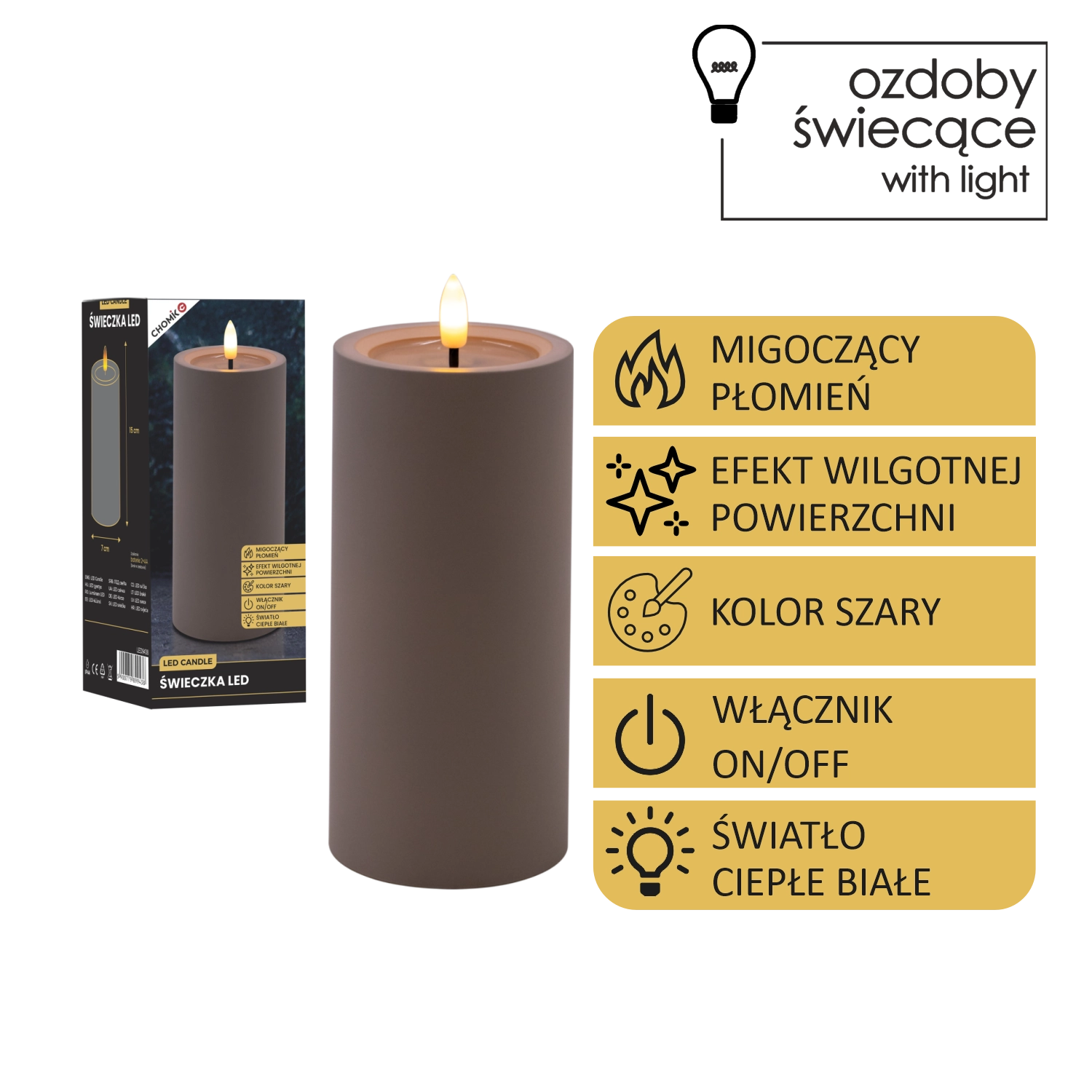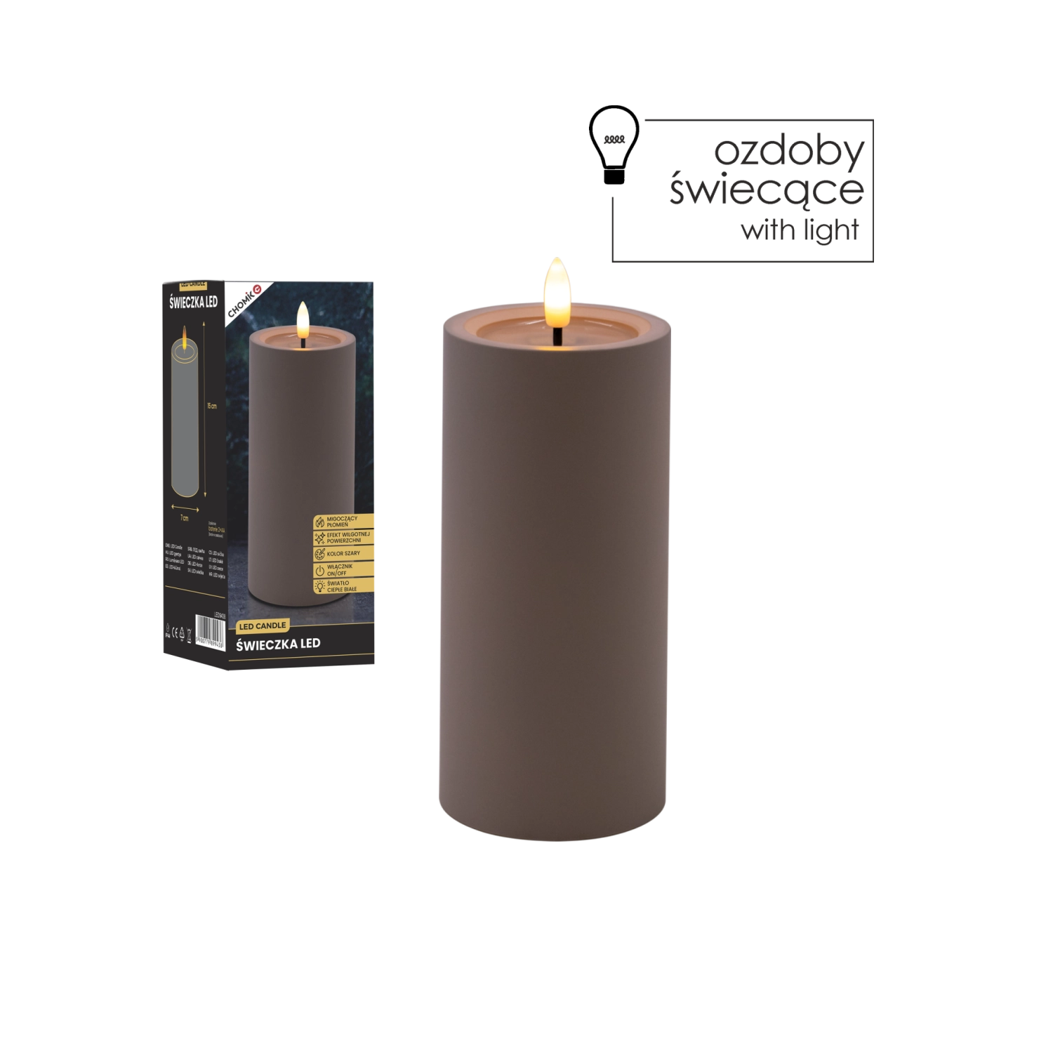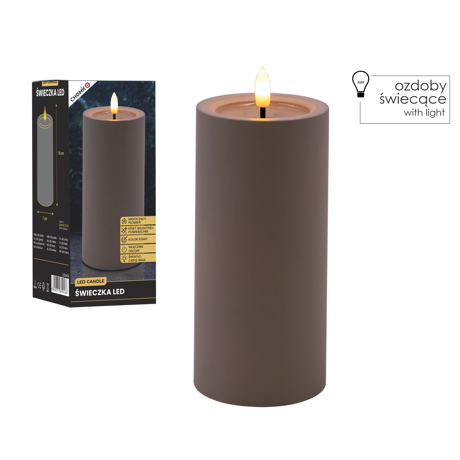 Bougie LED décorative de couleur grise avec une flamme vacillante réaliste en blanc chaud et un effet de bord supérieur humide. Parfaite pour compléter votre intérieur et créer une atmosphère chaleureuse sans fumée ni suie. Alimentation par 2× piles AA (non incluses).