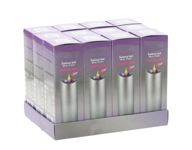 Bougie LED 5 × 15 cm avec surface argentée et flamme rose