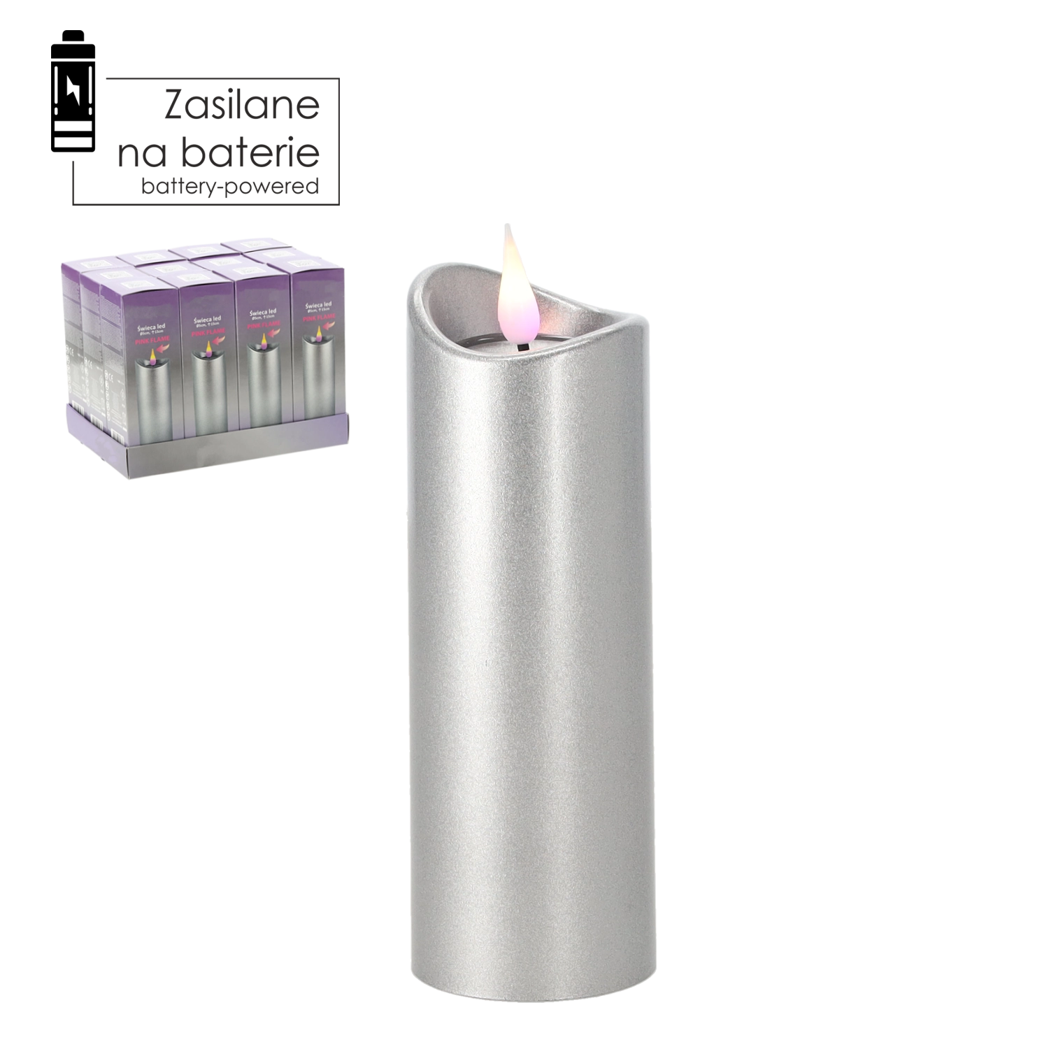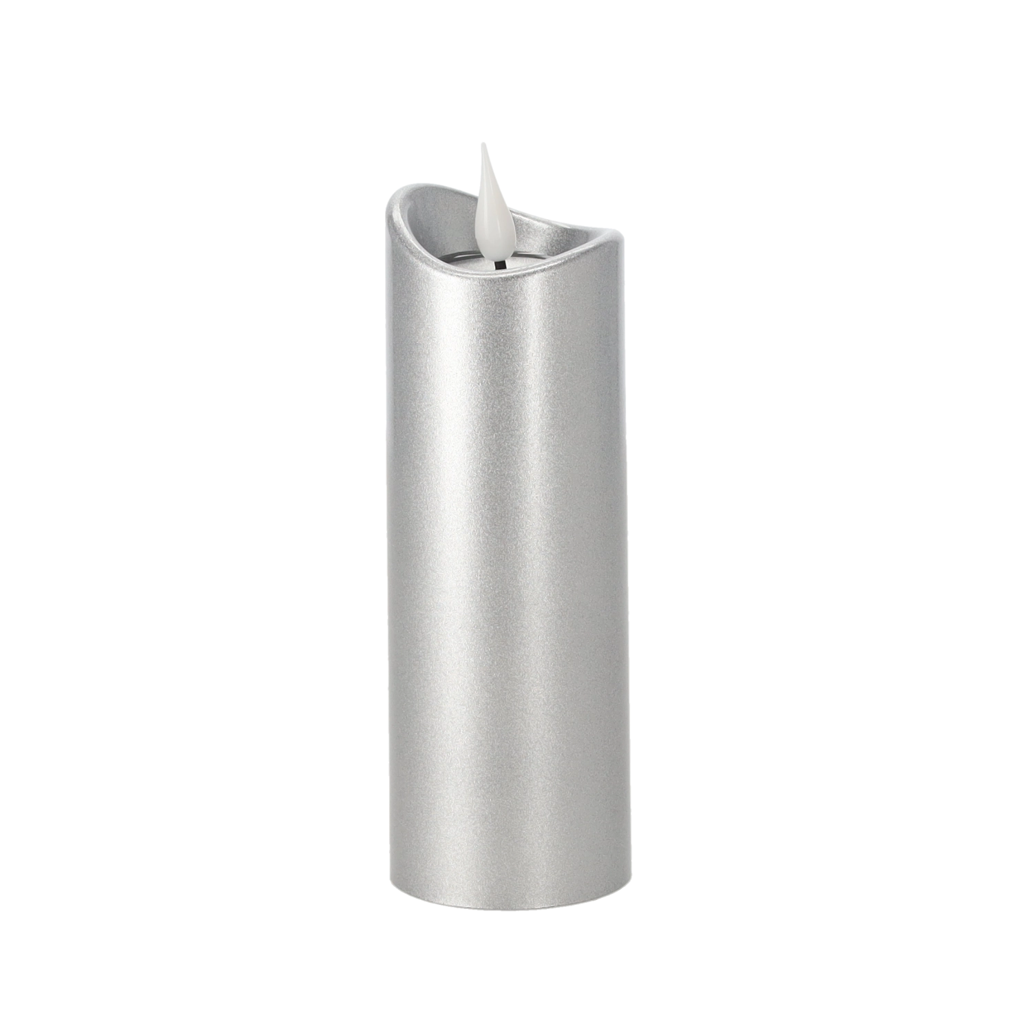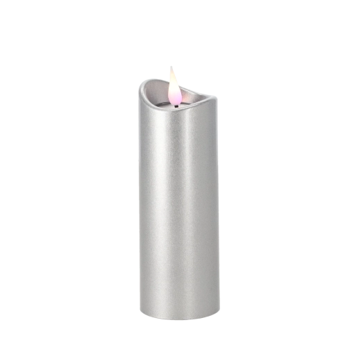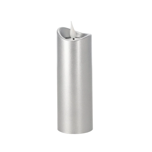 Bougie LED élégante de 5 × 15 cm en finition argentée avec effet de flamme rose. Elle offre un éclairage sûr et durable à piles (incluses), idéal pour la décoration intérieure comme pour la décoration de lieux de recueillement sans risque de flamme nue.