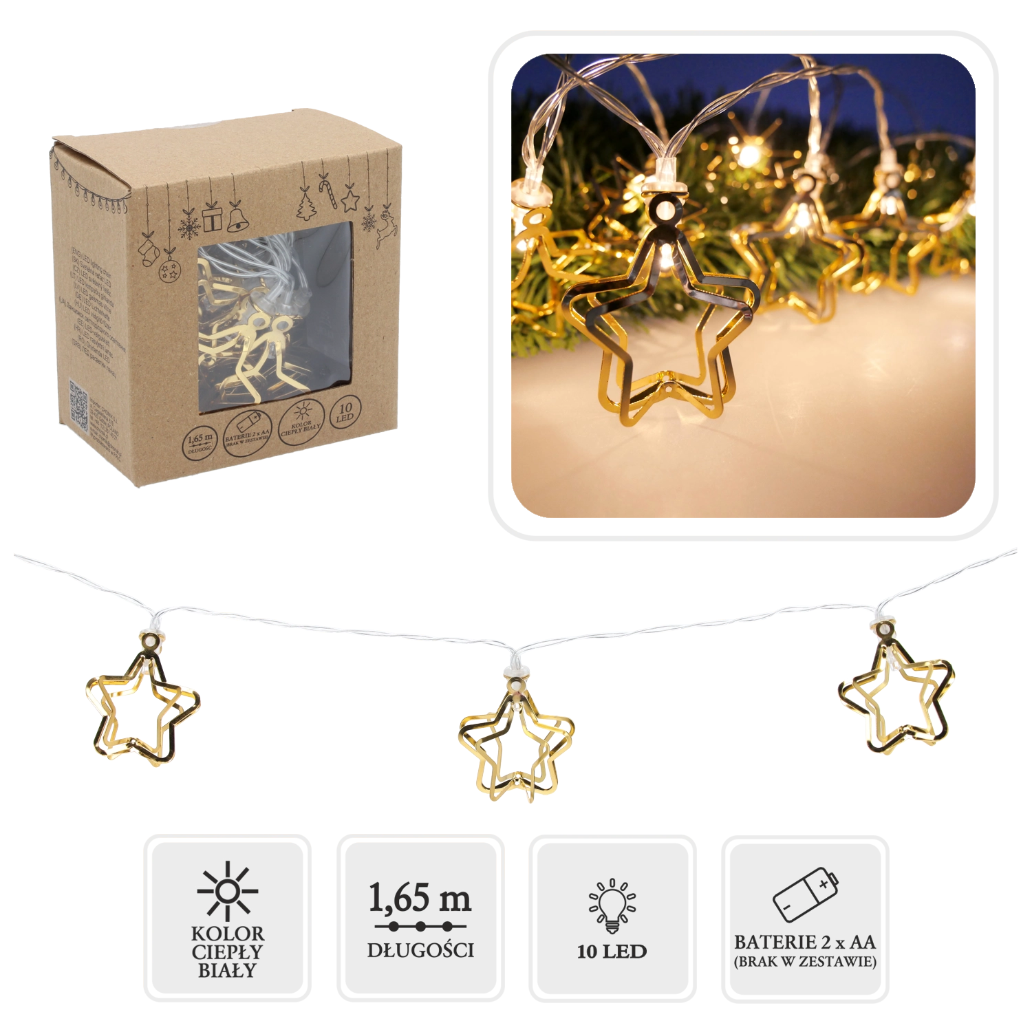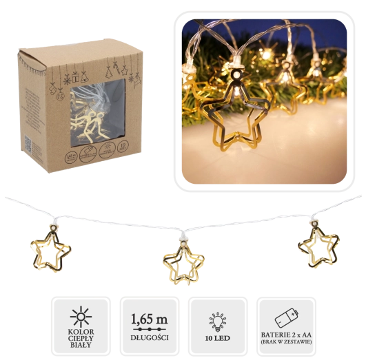 Apportez la magie de Noël chez vous avec une guirlande LED ornée de étoiles métalliques dorées 3D. Sa lumière blanc chaud crée une atmosphère cosy et, grâce à l’alimentation à piles (2× AA), vous pouvez l’installer partout sans câbles – sur une table, une commode, une cheminée ou une couronne.