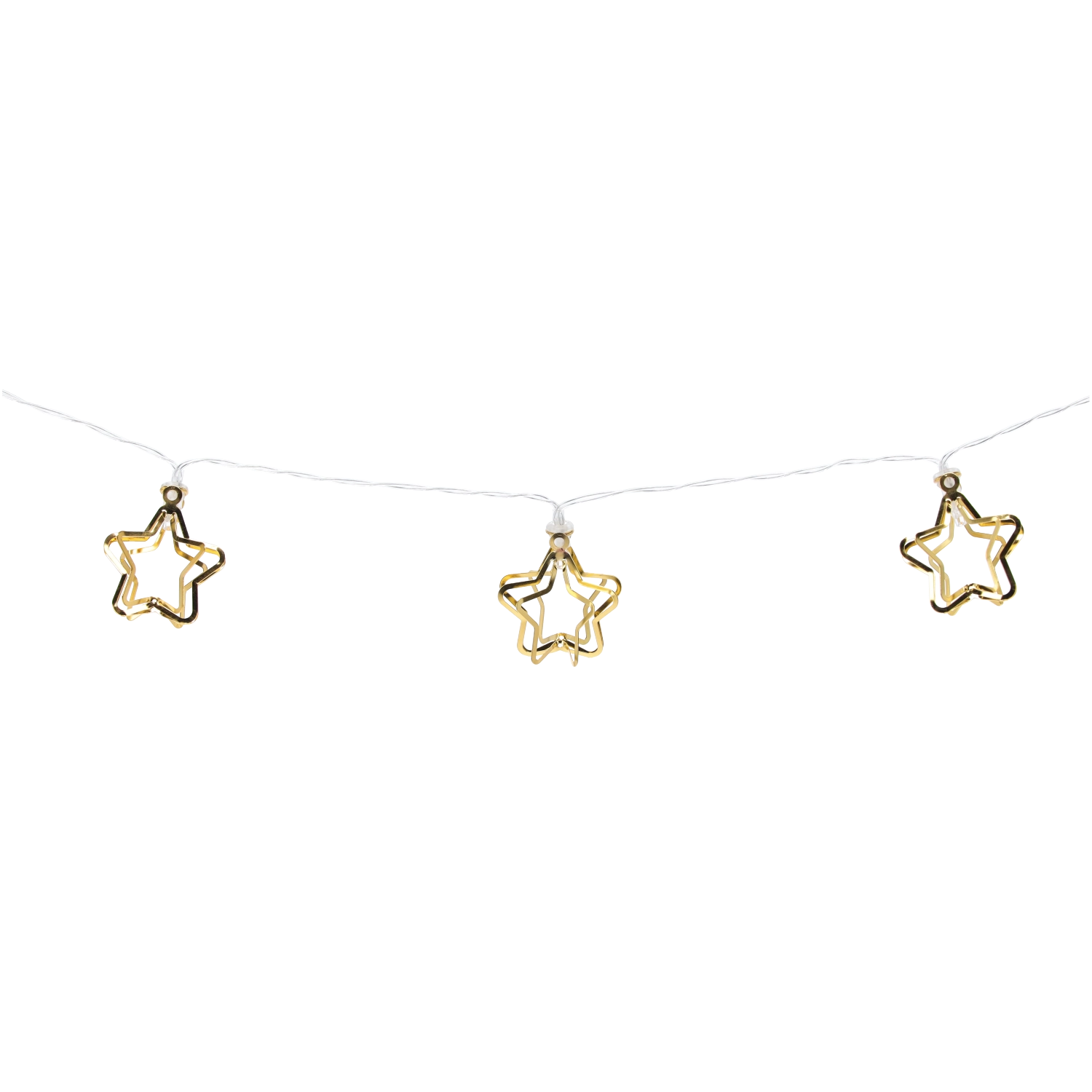 Guirlande LED décorative avec 10 diodes blanc chaud intégrées dans des étoiles transparentes à effet doré, idéale pour la décoration des fêtes ou pour embellir votre intérieur toute l’année. Les étoiles métalliques 3D apportent une touche élégante et un éclat raffiné à toutes les compositions – du glamour au boho.