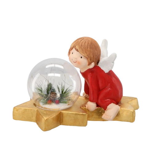 Adorable figurine de Noël représentant un ange avec une boule LED transparente qui apportera une atmosphère féérique à votre intérieur. Sur une étoile dorée, un ange en tenue rouge est agenouillé, tandis qu’à côté de lui brille une boule décorative avec des aiguilles de pin, des baies et une pomme de pin. Grâce au travail minutieux des détails, à la finition de surface brillante et au éclairage LED délicat, cette décoration est idéale pour une table, une étagère ou une commode. Les piles AAA ne sont pas incluses.