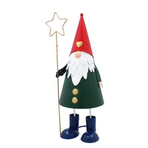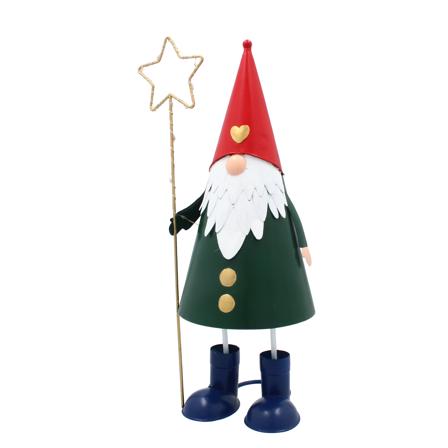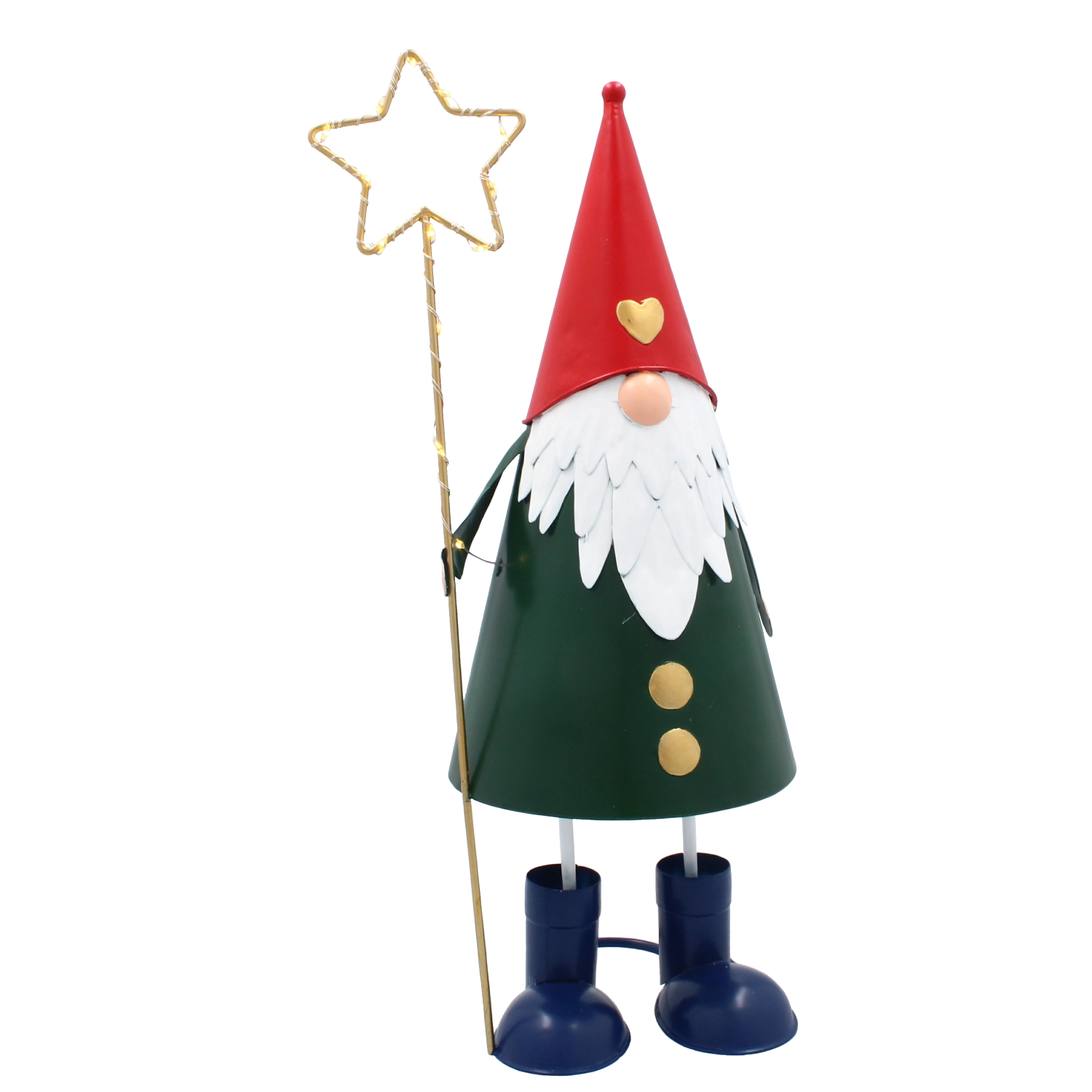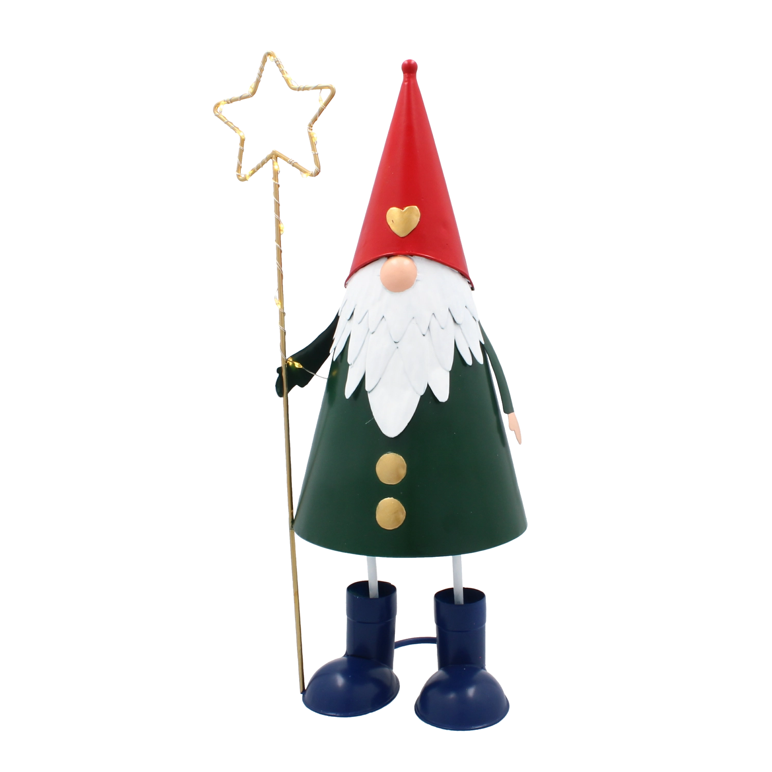 Ce lutin décoratif en métal allie look ludique et éclairage LED pratique. Sa silhouette haute et élancée avec bonnet rouge, corps vert et étoile dorée à la main apporte une touche stylée sur un rebord de fenêtre, une commode ou une table de fête. La lumière blanc chaud installe une ambiance conviviale dans chaque pièce.