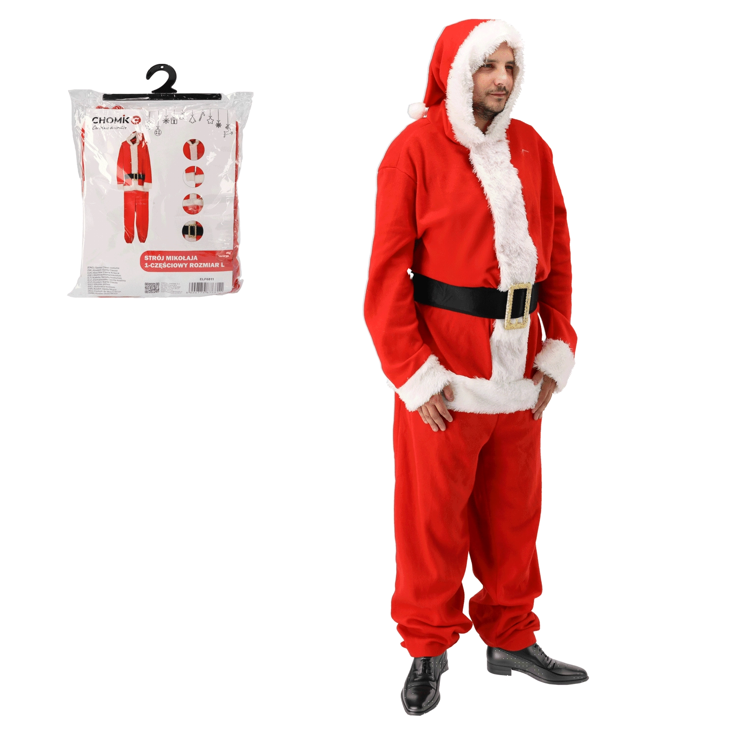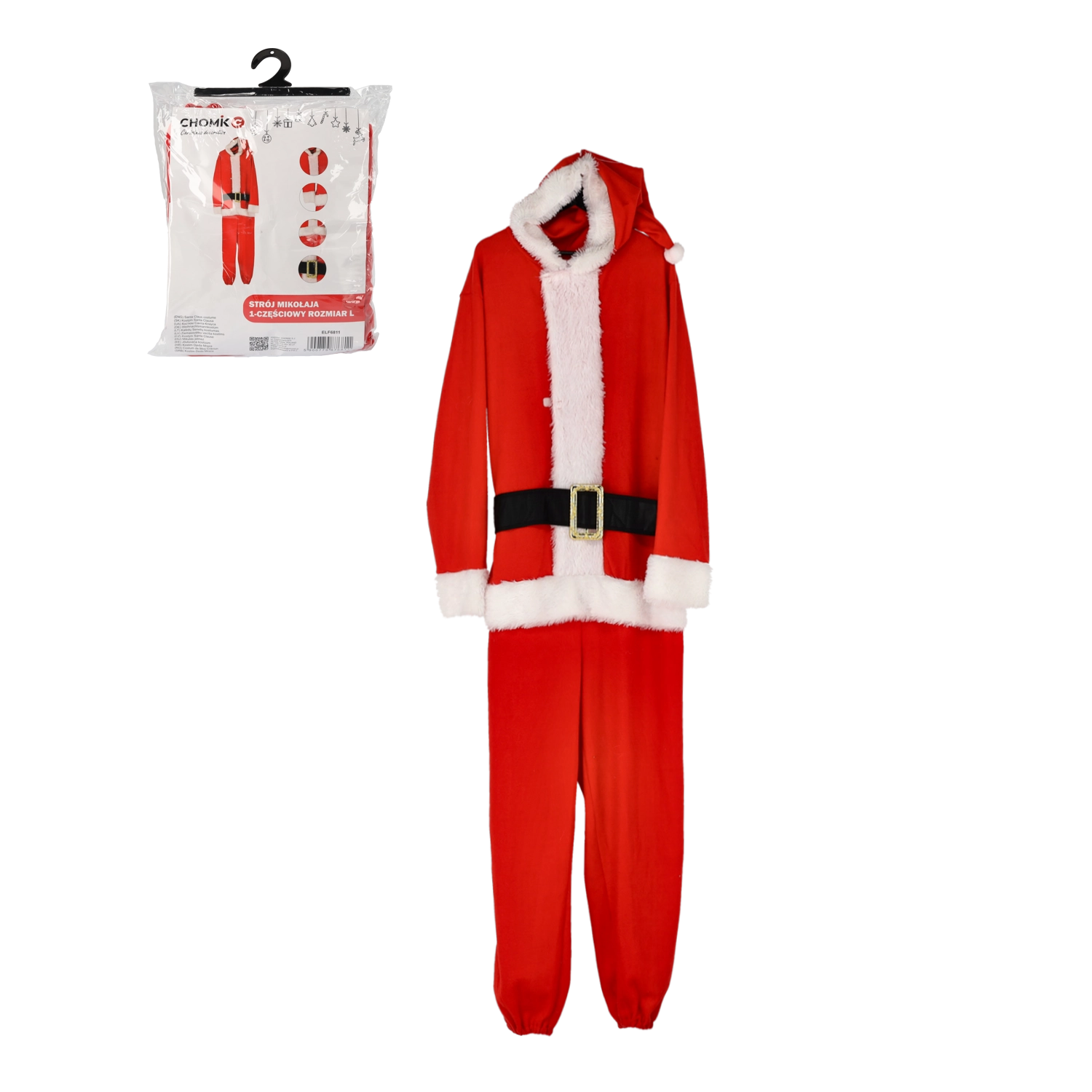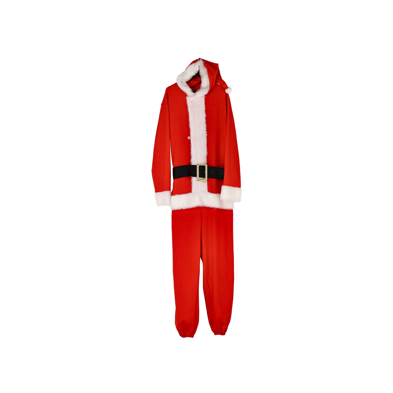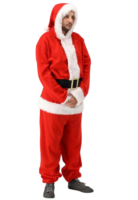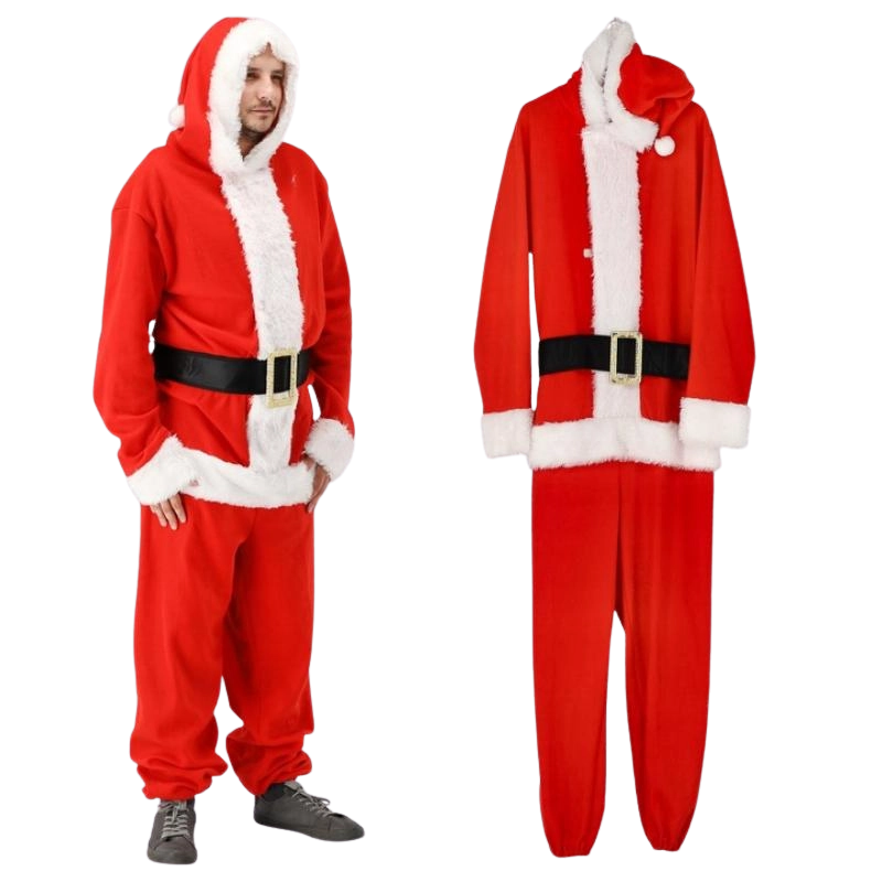 La couleur rouge intense, les bordures blanches façon fourrure et la ceinture noire créent un style festif immédiatement reconnaissable, qui se distingue en vrai comme en photo.