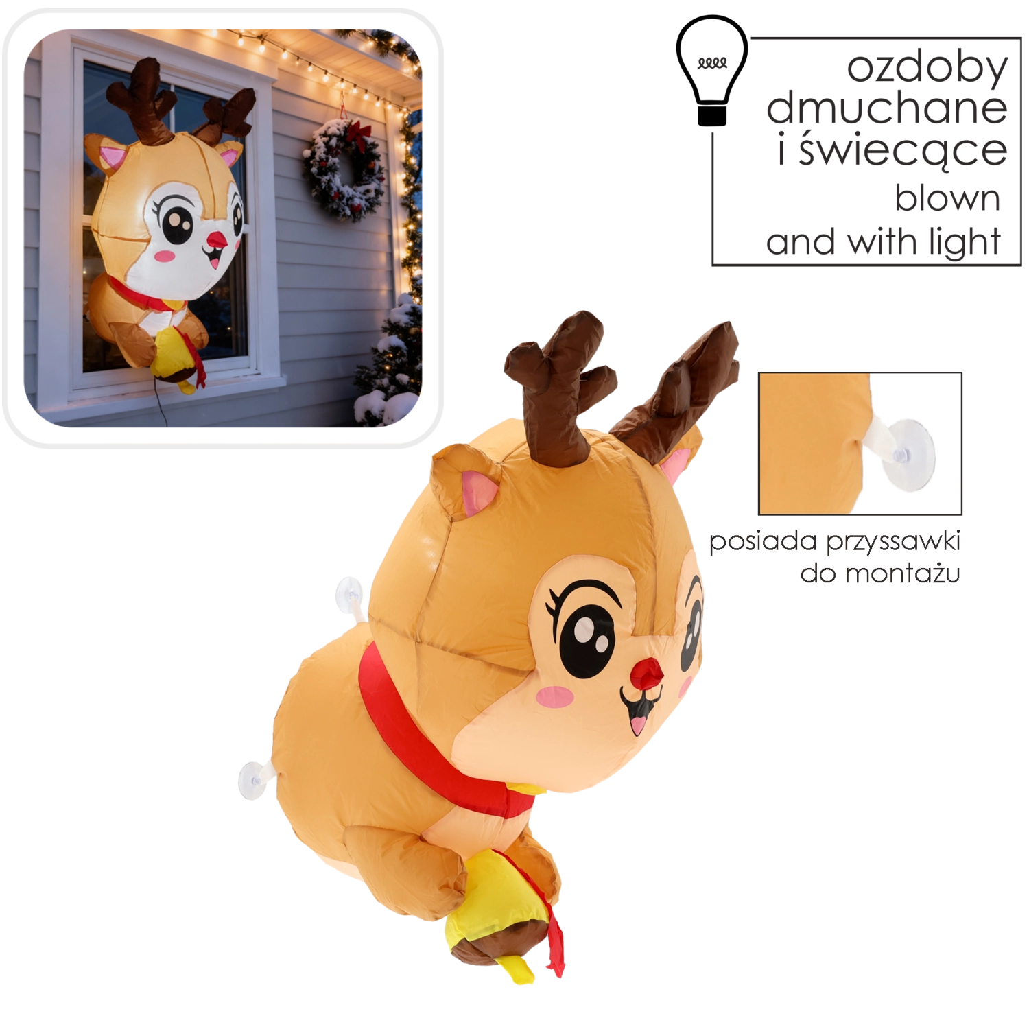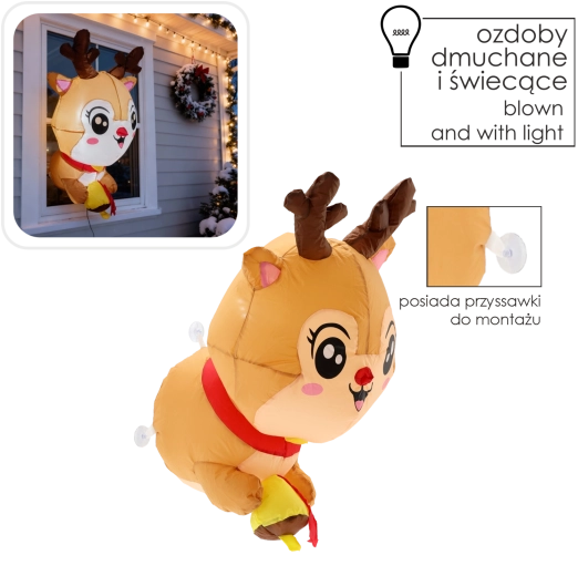 Ce renne gonflable adorable, avec ses grands yeux, ses bois et son écharpe rouge, illumine fenêtres, vitrines et entrées. La lumière LED chaude crée une atmosphère agréable en soirée et attire le regard de loin. L’installation se fait en un instant – grâce aux ventouses, il tient sur le verre lisse ou le miroir sans outils ni désordre.