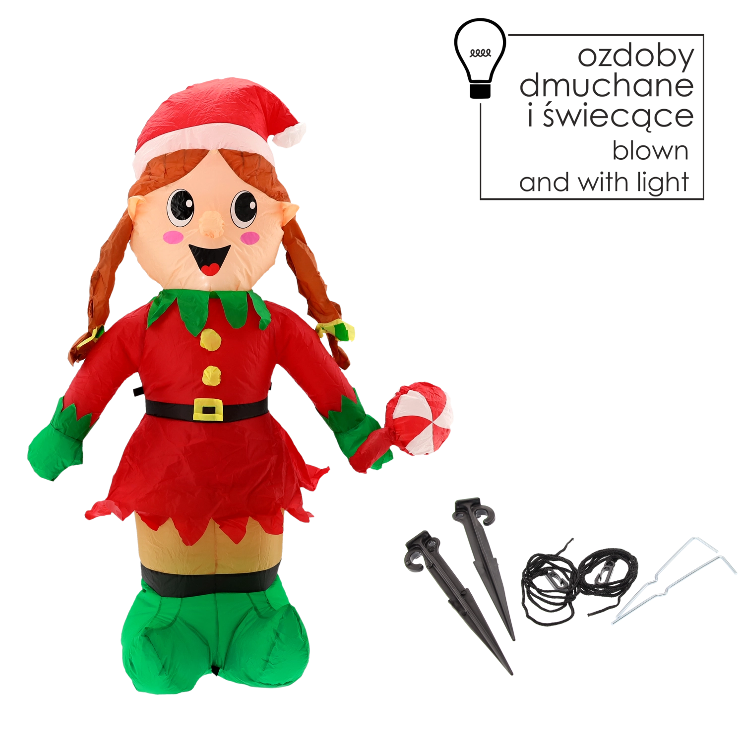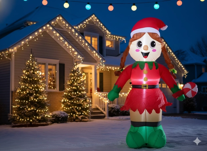 La décoration se gonfle automatiquement grâce à son ventilateur intégré et, pour une fixation en toute sécurité, le colis comprend des piquets et des cordes de tension. Son matériau durable et imperméable est prêt pour les conditions extérieures, pour que vous profitiez d’un décor de Noël sans souci pendant de nombreuses saisons.