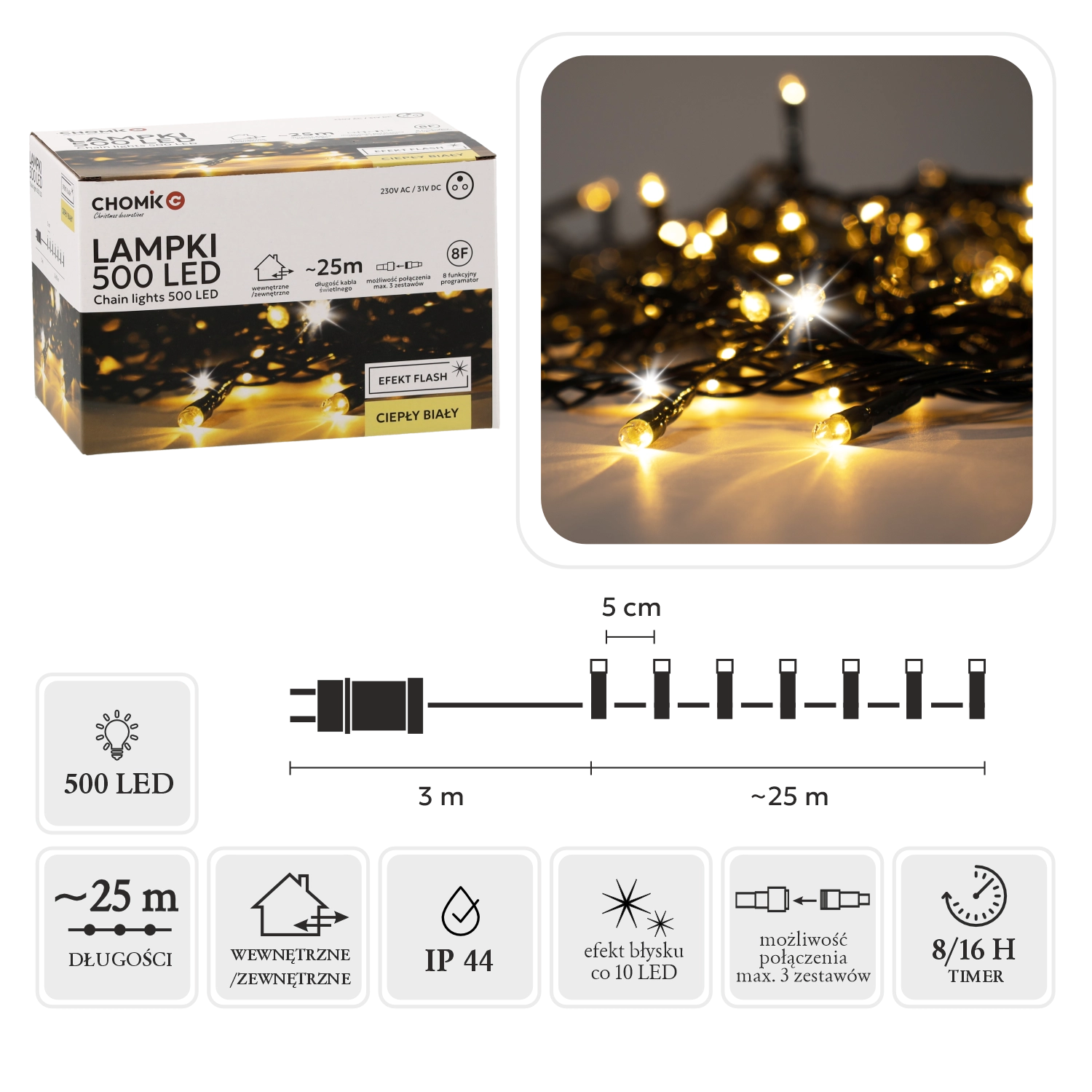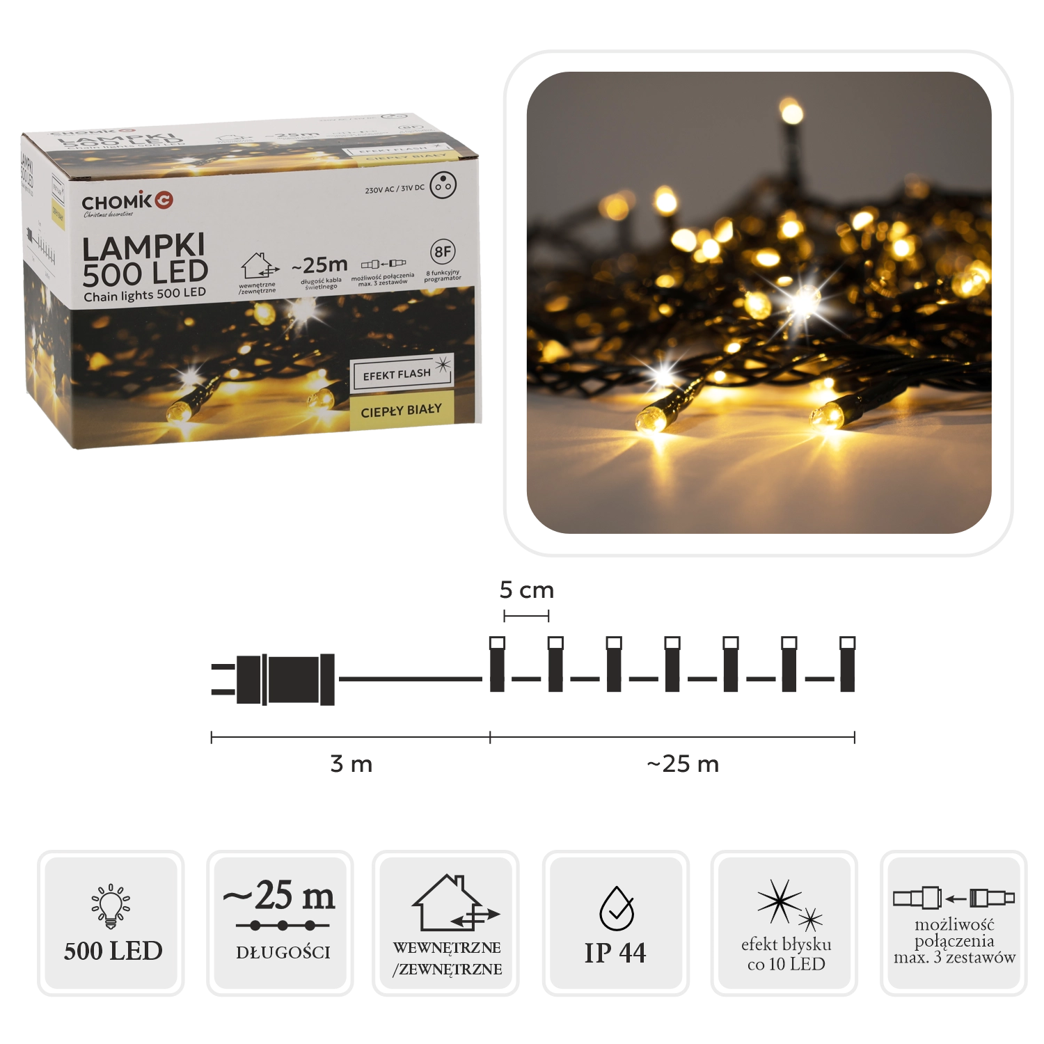 Illuminez votre maison et votre jardin avec une guirlande LED de 28 mètres dotée de 500 LED, émettant une lumière blanc chaud avec un éclat « flash » froid spectaculaire. Grâce à l’IP44, au programmateur avec mémoire et minuterie 8/16 h et à la possibilité de relier jusqu’à 3 guirlandes, l’installation est simple et le résultat impressionnant.