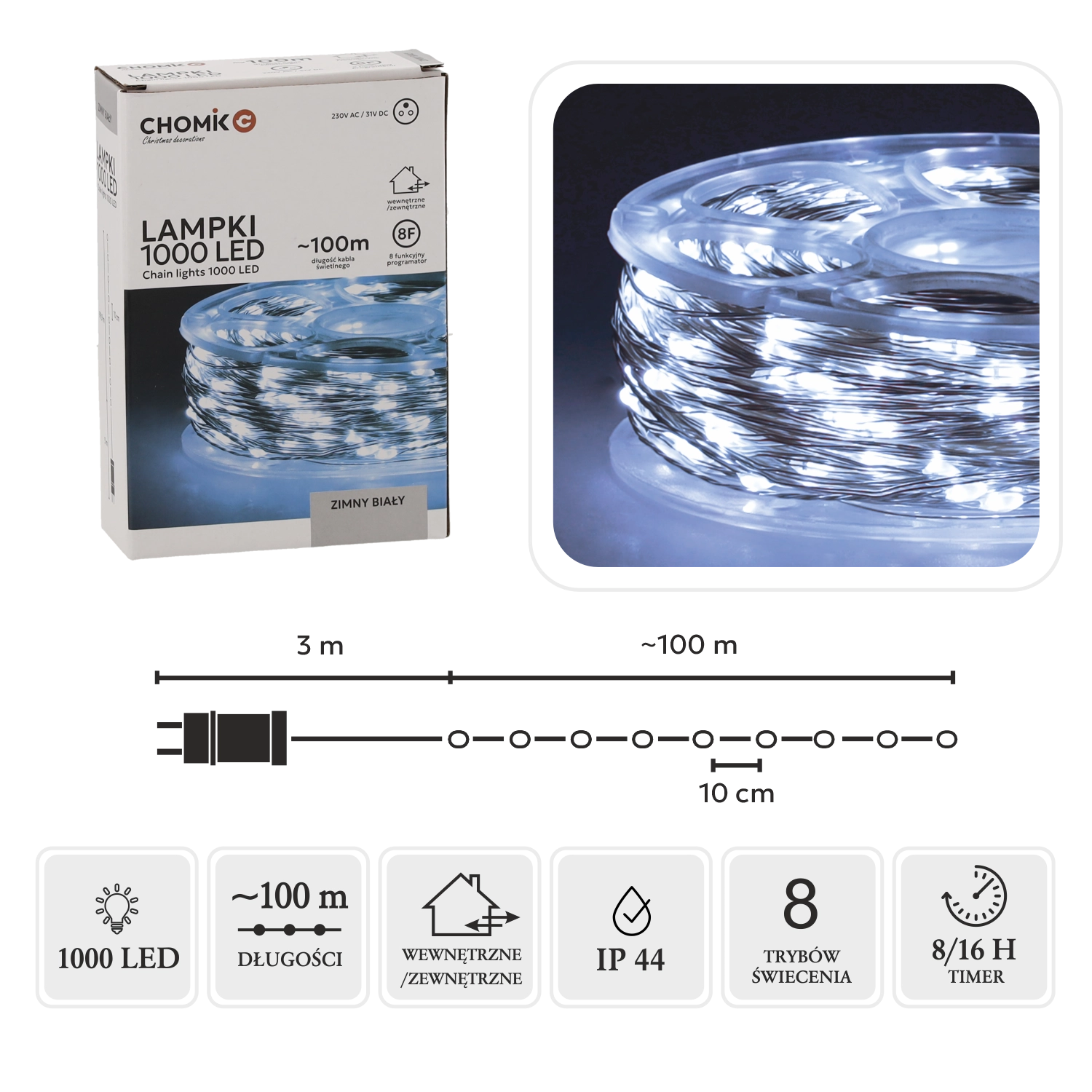 Illuminez votre maison ou votre jardin avec une guirlande lumineuse extra longue de 100 m et jusqu’à 1000 LED en blanc froid. Grâce au programmateur avec mémoire et minuterie 8/16 h, à la protection IP44 et au fin câble argenté, elle est parfaite pour les décorations de Noël, les fêtes et les ornements toute l’année, en intérieur comme en extérieur.