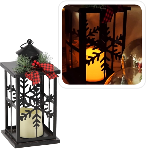 Apportez de la magie à vos fêtes avec cette lanterne LED en métal au noir intemporel. Grâce aux découpes en forme de flocons de neige, elle crée de superbes effets lumineux et une agréable ambiance hivernale. La « bougie » LED à l’intérieur assure un éclairage sûr et sans entretien, sans fumée ni dégagement de chaleur.