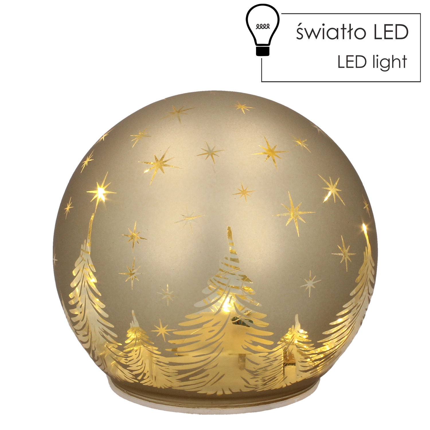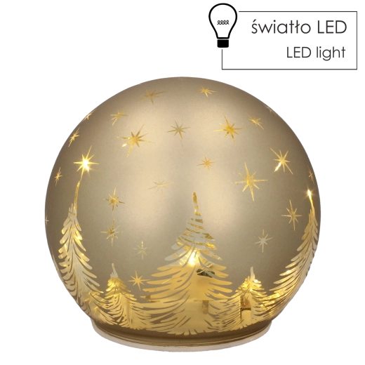 Élégante sphère en verre au fini doré luxueux avec éclairage LED intégré, elle apporte à votre intérieur une ambiance chaleureuse et festive. Une lumière douce à effet ciel étoilé crée une atmosphère cosy, tandis que les LED à faible consommation garantissent une longue durée d’utilisation sans gaspillage d’énergie. Ses dimensions compactes de 12 × 11 cm permettent une installation aisée sur une table, une étagère ou un rebord de fenêtre.