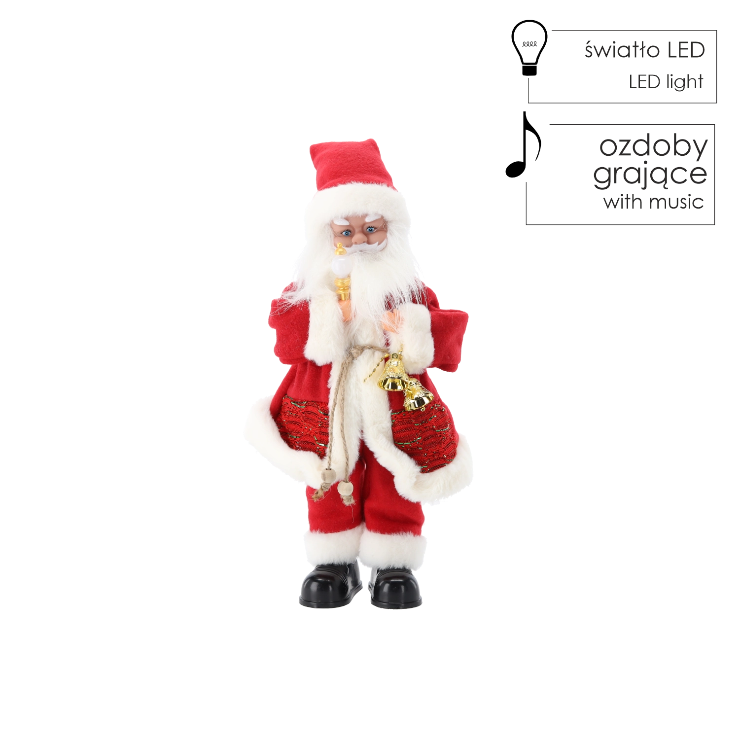 Cette élégante décoration de Noël associe le motif traditionnel du PÈRE NOËL à des éléments modernes – éclairage LED et fonction musicale. Des détails soignés, un costume doux et des accessoires comme la bougie ou la clochette apportent à votre intérieur une touche chaleureuse et festive.