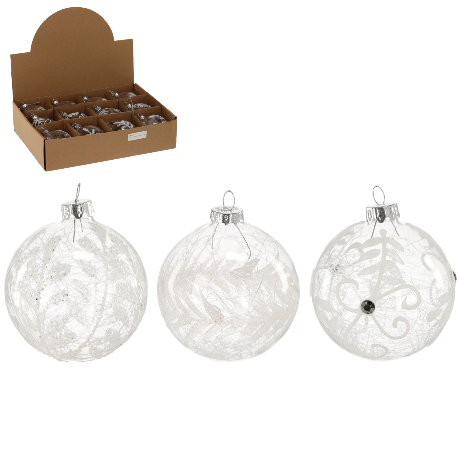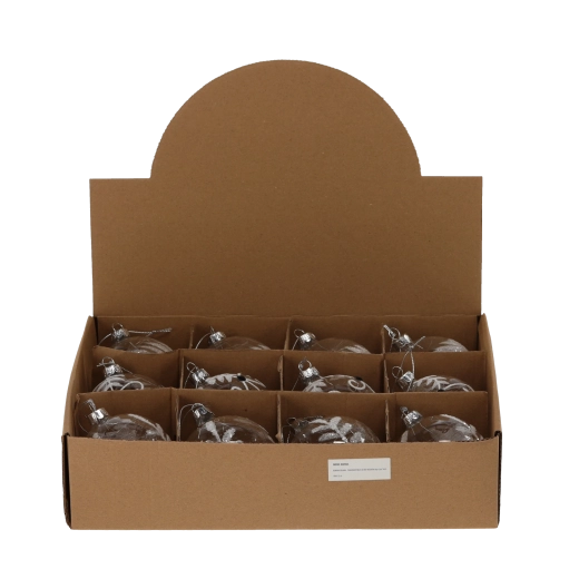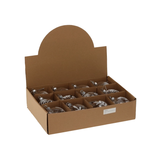 Élégante boule de Noël en verre de 8 cm de diamètre, en version transparente, qui apporte à l’arbre et à l’intérieur une brillance intemporelle et une douce élégance. Grâce au mélange de motifs, elle se combine facilement avec tout style de décoration, du classique au moderne. Le verre de qualité garantit une longue durée de vie et une résistance aux dommages, idéale pour une utilisation en intérieur.