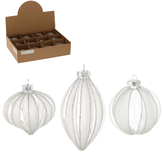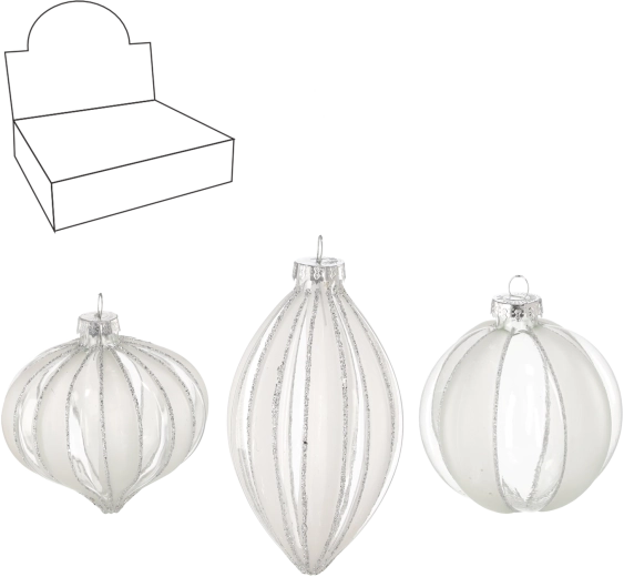 Le set comprend un assortiment de différents motifs et formes – boules rondes et gouttes allongées. Grâce à leur teinte transparente et neutre, elles s’harmonisent aisément avec des décorations traditionnelles comme modernes. Elles conviennent au sapin, aux compositions de fête et aux couronnes élégantes.
