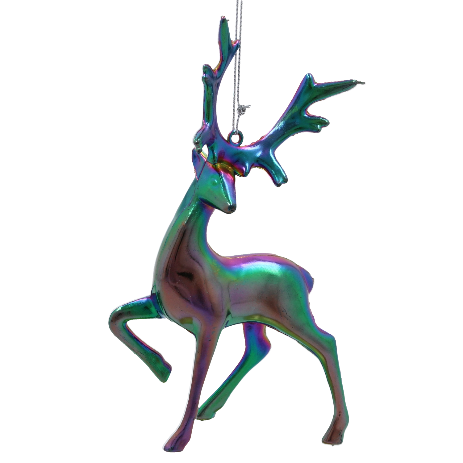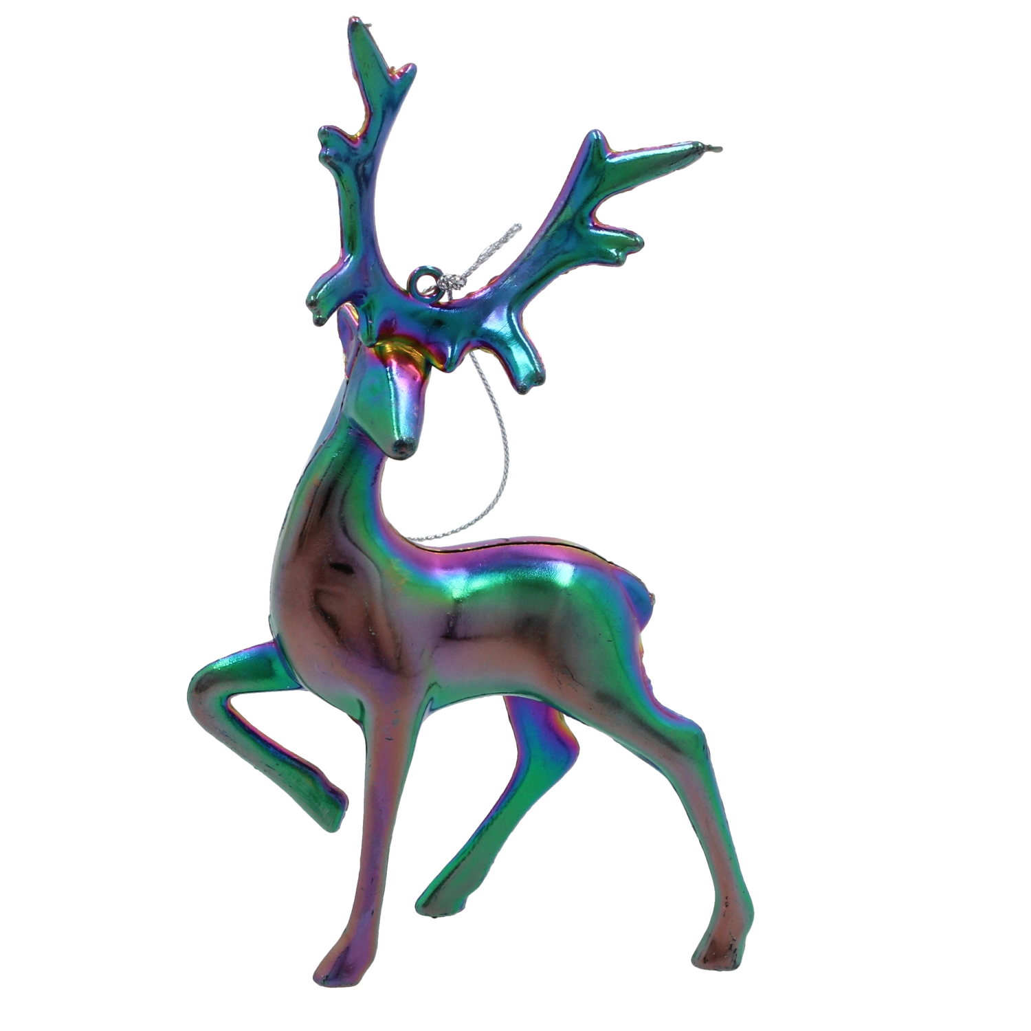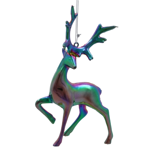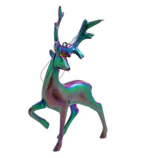 Cette décoration design en forme de renne se distingue par une surface lisse et brillante avec un effet irisé « essence » qui varie selon l’incidence de la lumière, du violet au vert jusqu’aux tons bleus. Grâce à ces reflets changeants, elle apporte sur le sapin un accent marqué mais de bon goût.