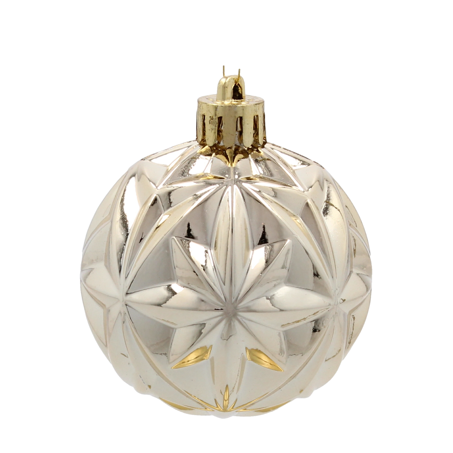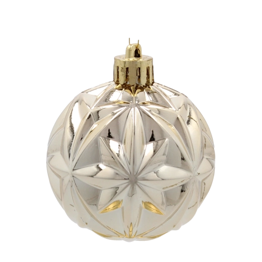 Le motif étoilé en relief sur la boule argentée crée des reflets et ajoute une structure marquée au sapin.