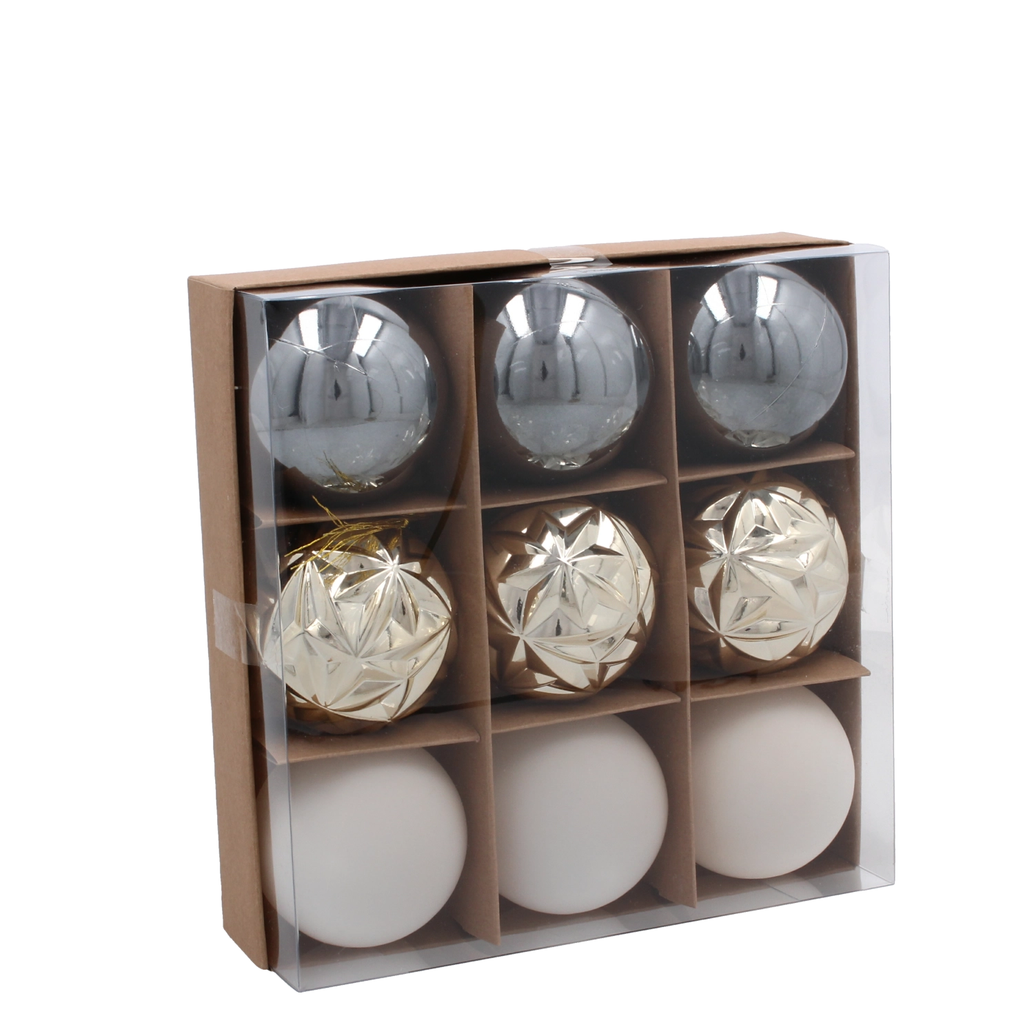 Set de boules de Noël 6 cm dans des tons champagne, gris et blanc – 9 pcs